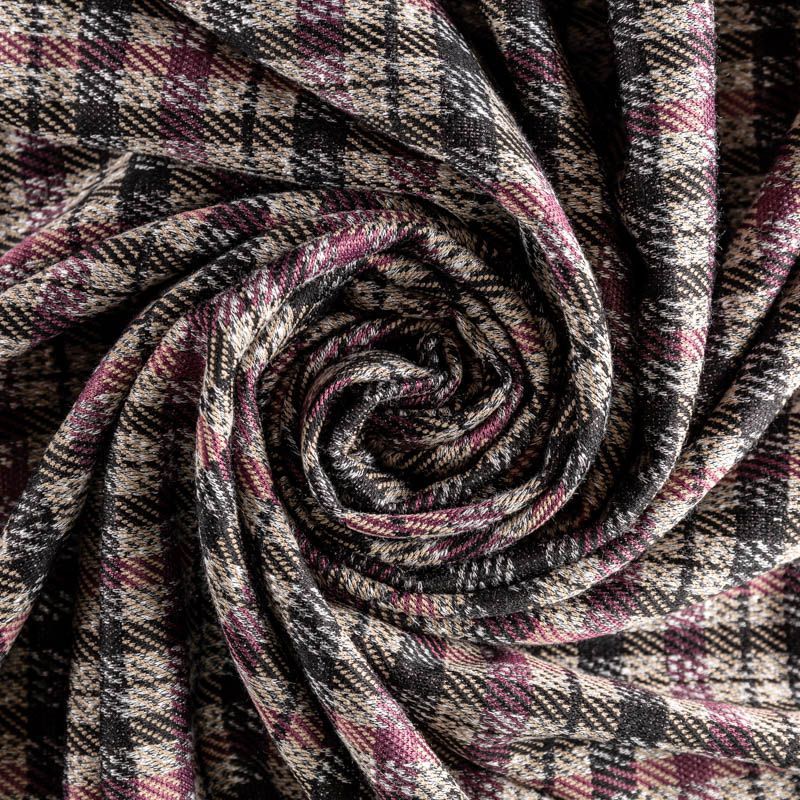 Плотный вязаный трикотаж с вискозой. Сочетание линий черного, серого и террактового оттенков образует сложную красивую клетку.    Материал мягкий, пластичный, хорошо тянется, практически не просвечивает и отлично подходит для изготовления платья, юбки, жакета или кардигана.