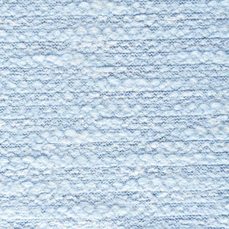 Букле на трикотажной основе с сочетанием голубых и молочно-белых нитей. Материал пластичный, плотный, плетение немного тянется. Подойдет для пошива облегченного пальто, теплого кардигана, юбки, свитера, пончо.