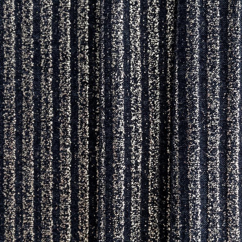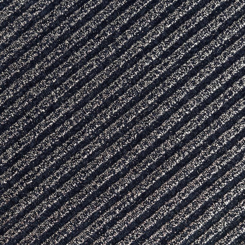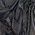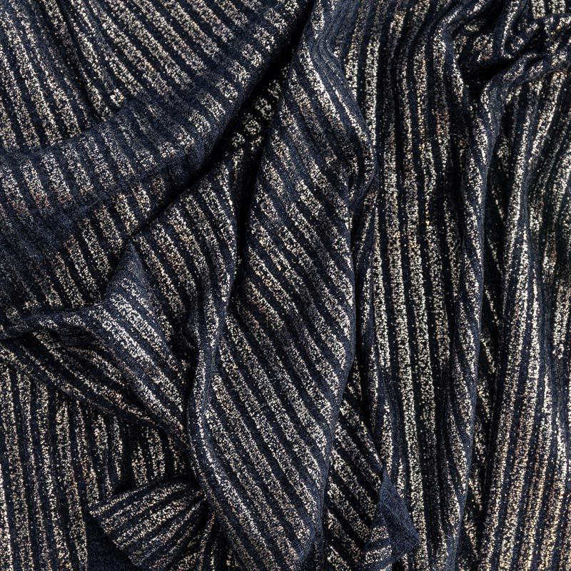 Трикотаж-лапша средней плотности, с высокой степенью эластичности, поверхность рельефная за счет эффекта резинки и мерцающая за счет металлизированного напыления. С изнанки трикотаж гладкий, комфортный, подходит для использования без подклада. Сшить из такого полотна можно водолазки, платья, топы, юбки, комплекты, нарядные изделия. Направление полос - вдоль линии кромки.