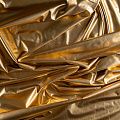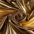 Эффектное трикотажное полотно с золотым металлическим блеском. Материал очень пластичный, образует струящиеся мягкие складки, отлично тянется, не просвечивает, не мнется. Изнаночная сторона матовая, приятная на ощупь. Идеальный выбор для нарядных моделей, гимнастических и танцевальных костюмов.