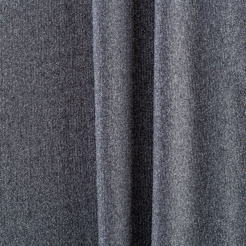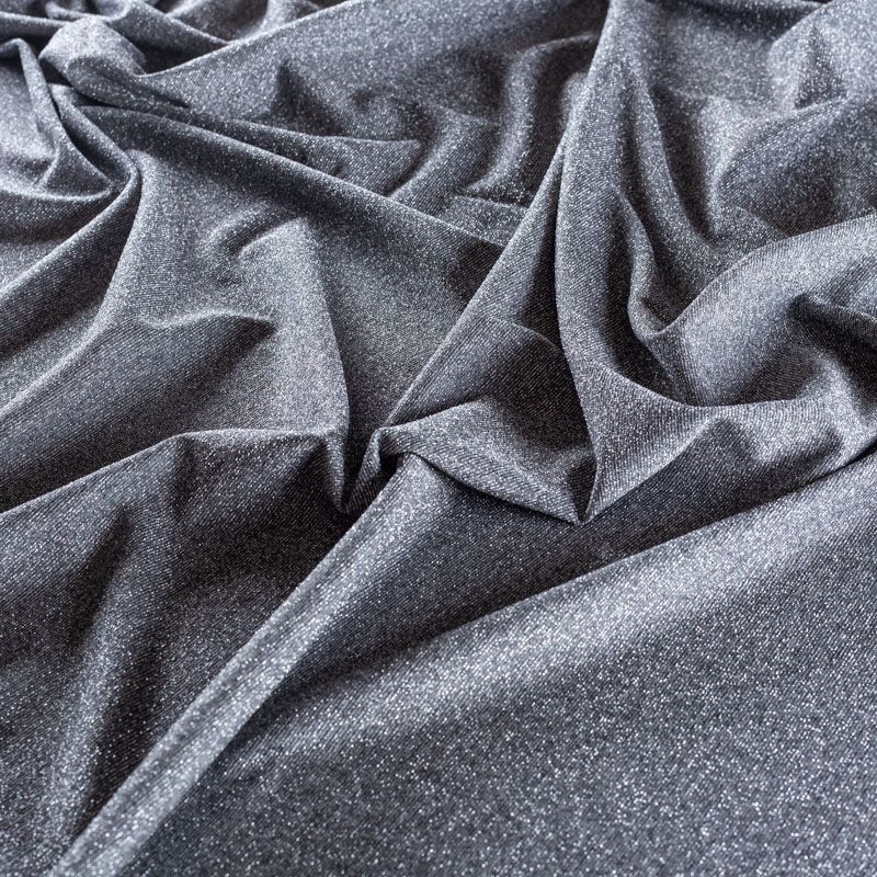Итальянский вискозный трикотаж серого оттенка с добавлением серебристой люрексной нити. Поверхность шероховатая на ощупь,  ткань очень плотная за счет плетения, пластичная, хорошо тянется, не просвечивает. Прекрасно подойдет для пошива лонгслива, гольфа, футболки, кардигана, платья или юбки в спортивном стиле.