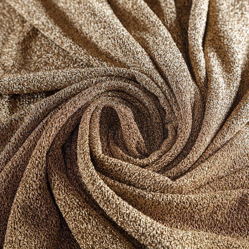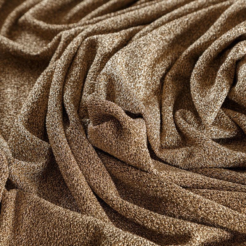 Трикотажное полотно с металлизированным блеском и мерцанием. Золотистые люрексные нити вплетены в структуру полотна и создают объемный "вспененный" эффект, при этом изнанка гладкая и ровная. Ткань очень приятная к телу, не колется, не просвечивается, очень эластичная, отлично драпируется и ниспадает, красиво ляжет по фигуре. Идеальный вариант для пошива вечерних и нарядных платьев облегающего силуэта, топов, комбинезона, юбки, широких брюк, туник, кардиганов, накидок.