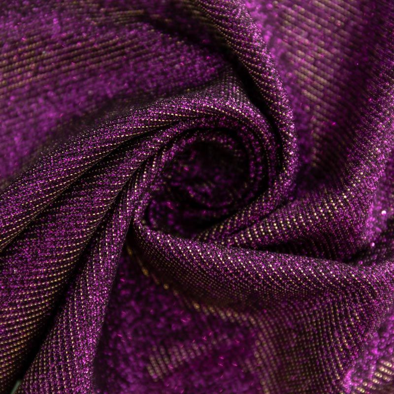 Мягкое и эффектное трикотажное полотно с металлизированным напылением. Структура полотна плотная, легко растяжимая, эластичная. С лицевой стороны поверхность ткани  слегка шероховатая на ощупь, характеризуется заметным блеском «металлик». С изнанки трикотаж гладкий, комфортный, подходит для использования без подклада. Отлично пододет для пошива водолазки, платья, топа, леггинсов, спортивных купальников, нарядных изделий.