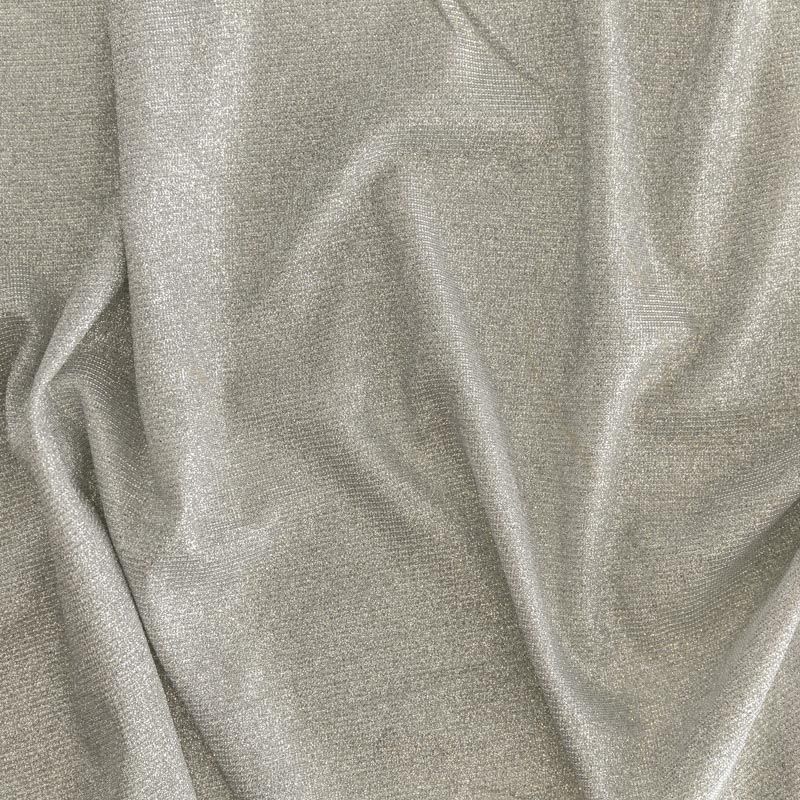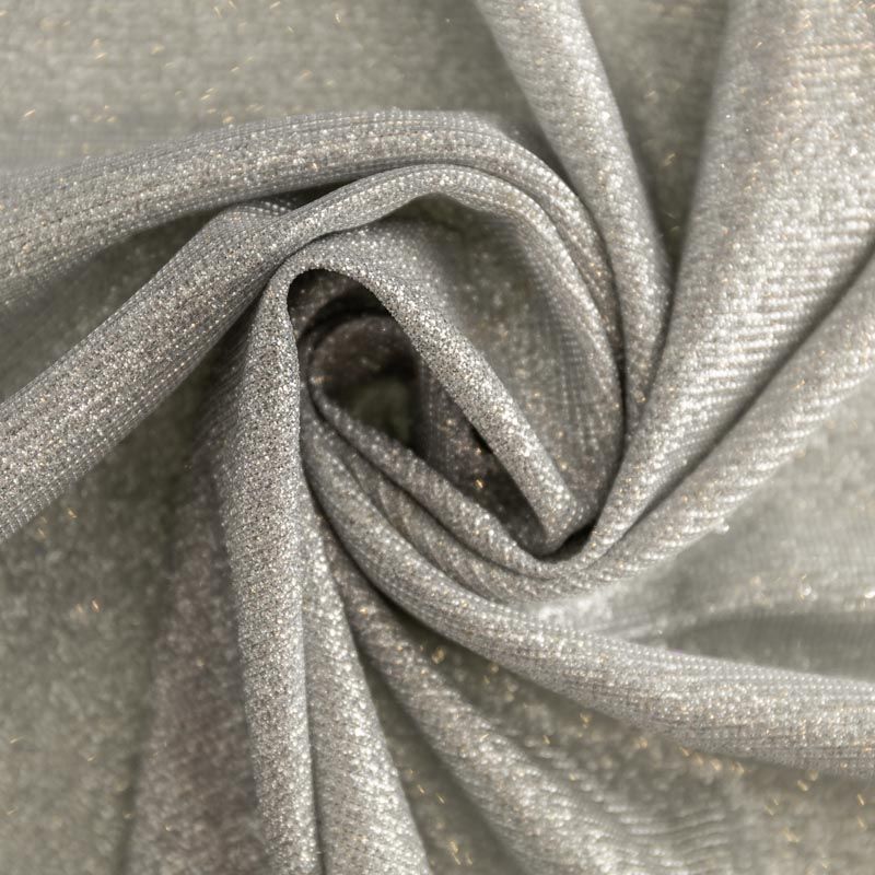 Мягкое и эффектное трикотажное полотно с металлизированным напылением. Структура полотна плотная, легко растяжимая, эластичная. С лицевой стороны поверхность ткани  слегка шероховатая на ощупь, характеризуется заметным блеском «металлик». С изнанки трикотаж гладкий, комфортный, подходит для использования без подклада. Отлично пододет для пошива водолазки, платья, топа, леггинсов, спортивных купальников, нарядных изделий.