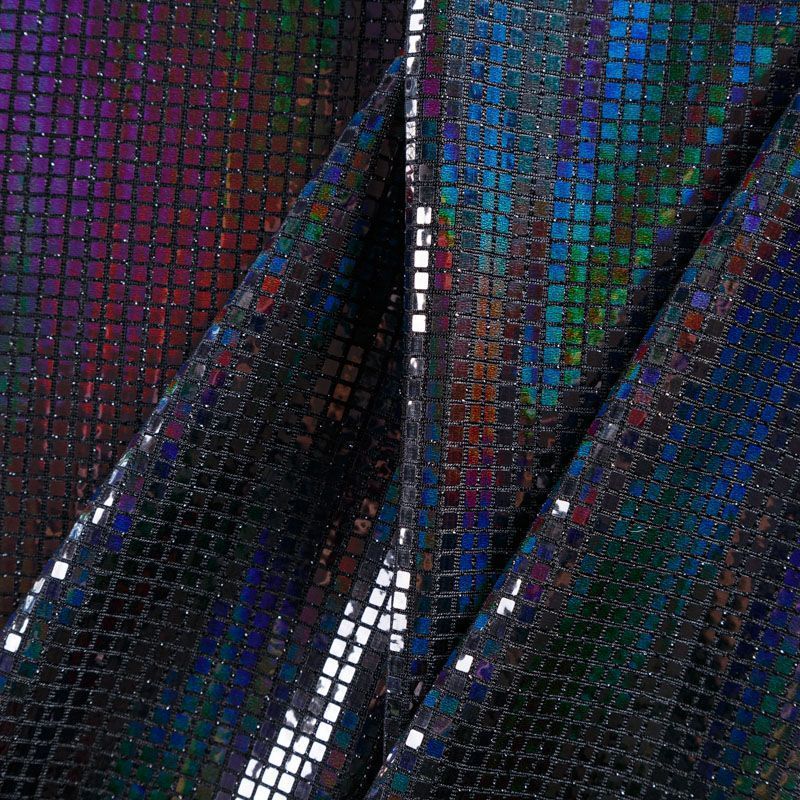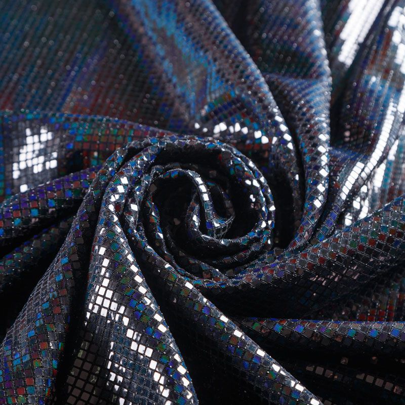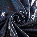 Трикотажное черное полотно с блестящими зеркальными "бензиновыми" квадратными пайетками. Декор накатан на основу, поэтому будет комфортен в носке. Ткань пластичная, прекрасно драпируется и укладывается в складки, легко садится по фигуре за счёт основы с эластаном, не прозрачная, позволит шить изделия без подклада. Идеально подойдет для пошива нарядных вечерних образов: платья, юбки, топа, туники, широких брюк, жакета, кардигана.