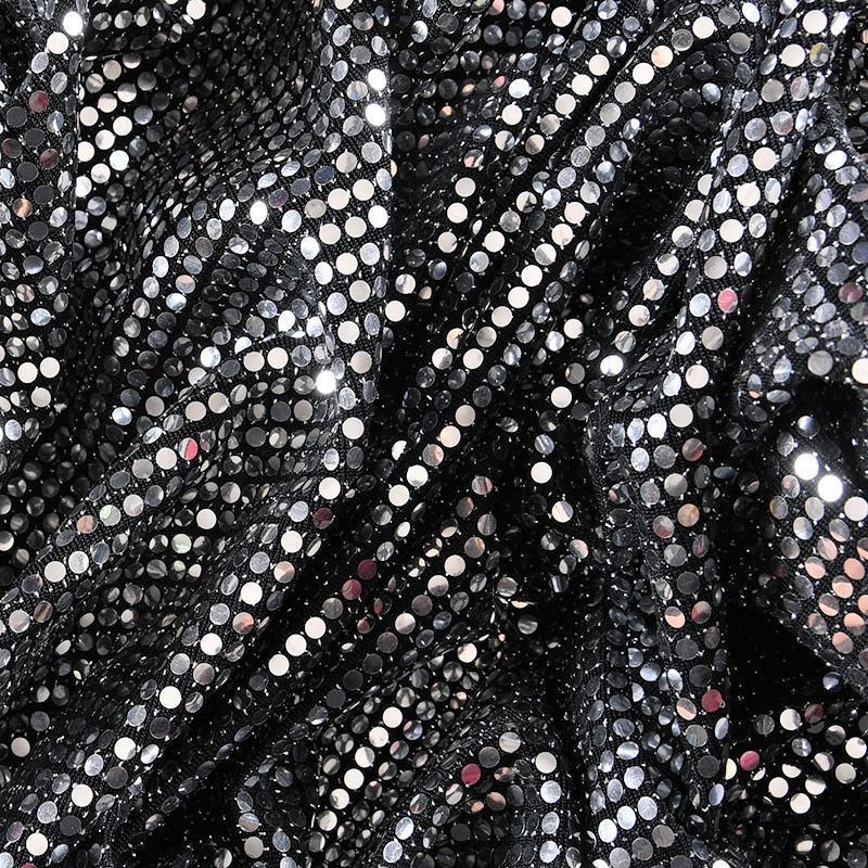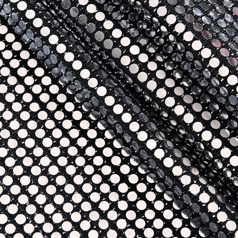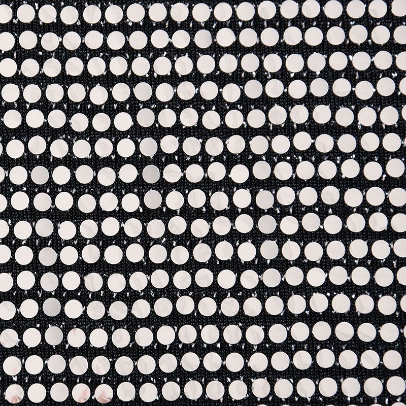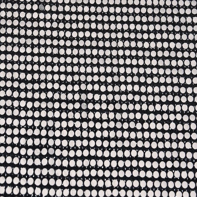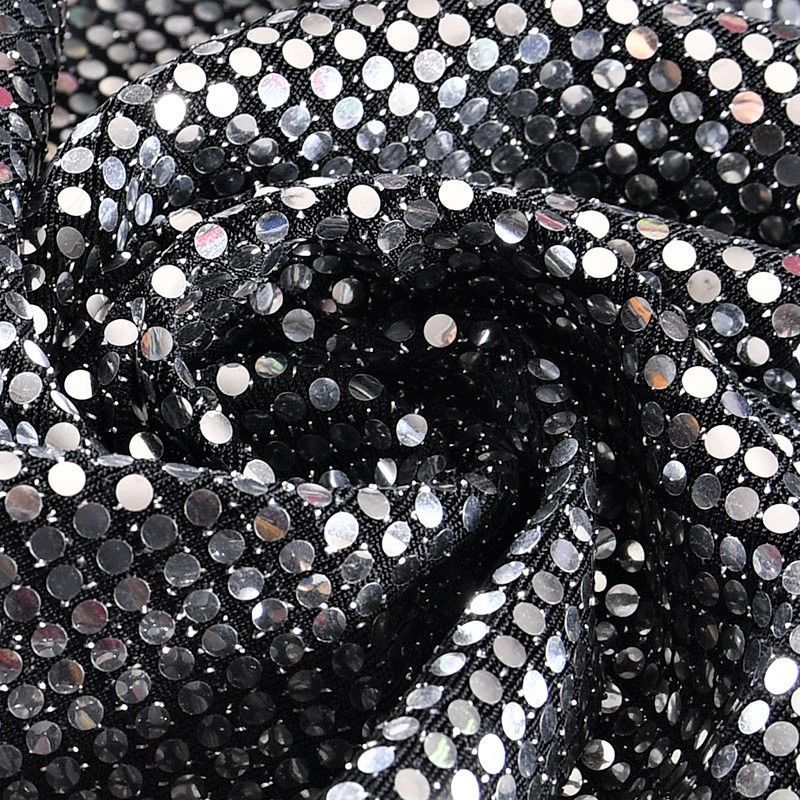 Трикотажное черное полотно с блестящими зеркальными серебристыми круглыми пайетками. Декор накатан на основу, поэтому будет комфортен в носке. Ткань пластичная, прекрасно драпируется и укладывается в складки, легко садится по фигуре за счёт основы с эластаном, не прозрачная, позволит шить изделия без подклада. Идеально подойдет для пошива нарядных вечерних образов: платья, юбки, топа, туники, широких брюк, жакета, кардигана.