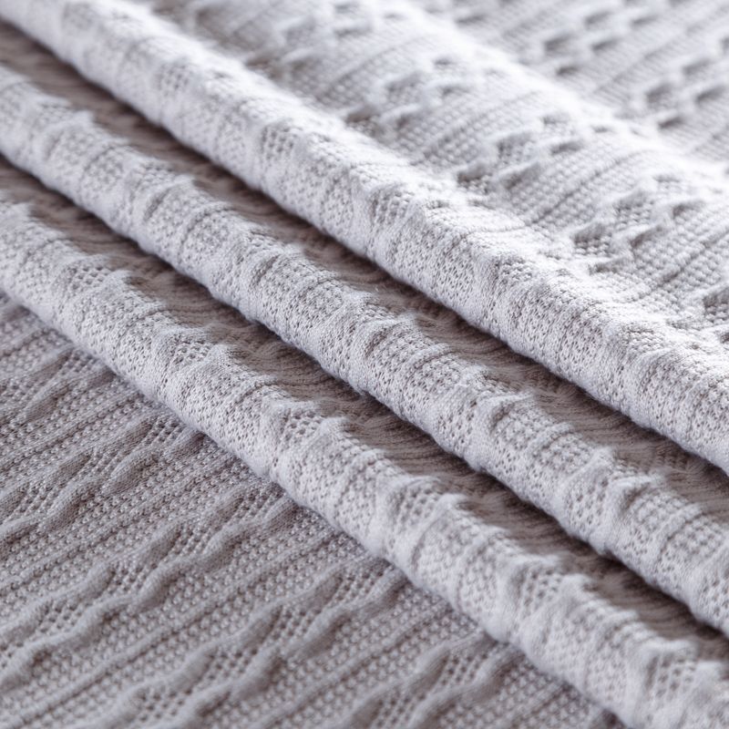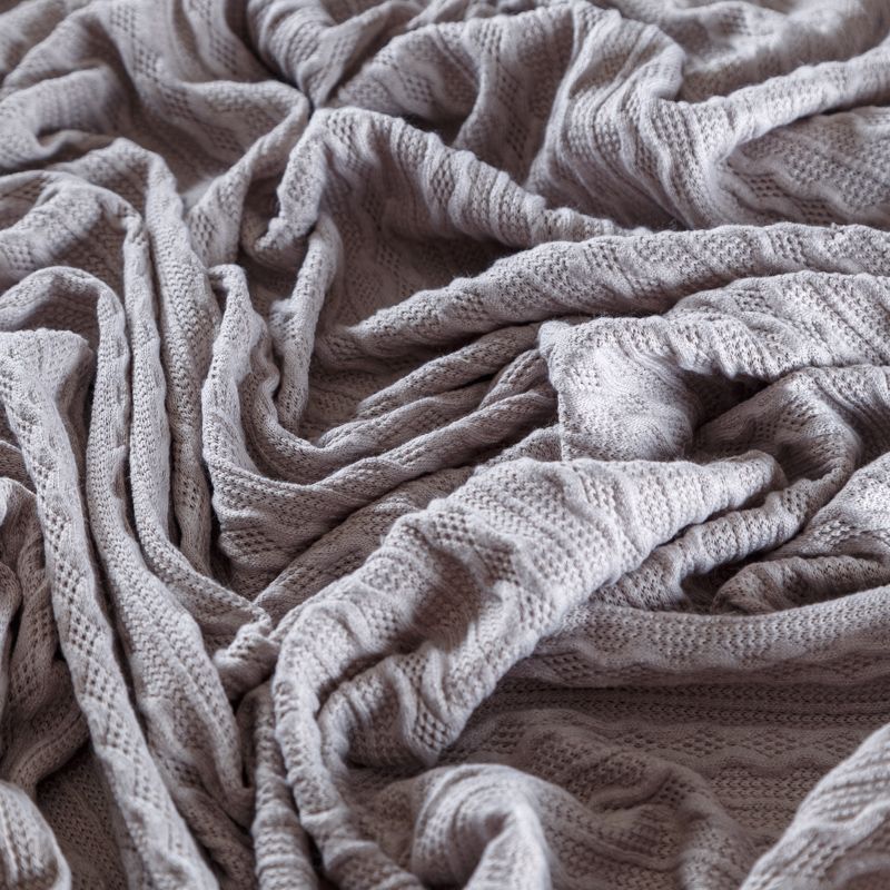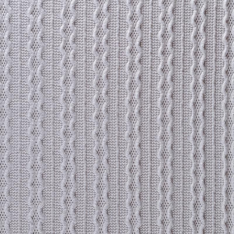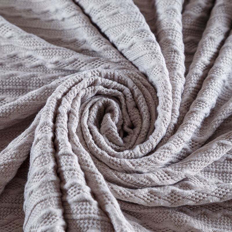 Текстурное вязаное, мягкое, пластичное полотно средней плотности в сером оттенке. Вязаный узор - стилизованая косичка с полосками расположен по всему полотну. Подойдет для пошива уютного свитера, кардигана, юбки, платья, водолазок, снудов и головных уборов.