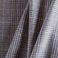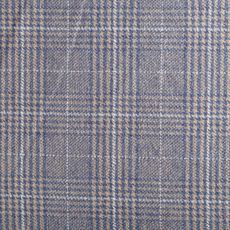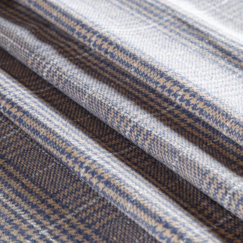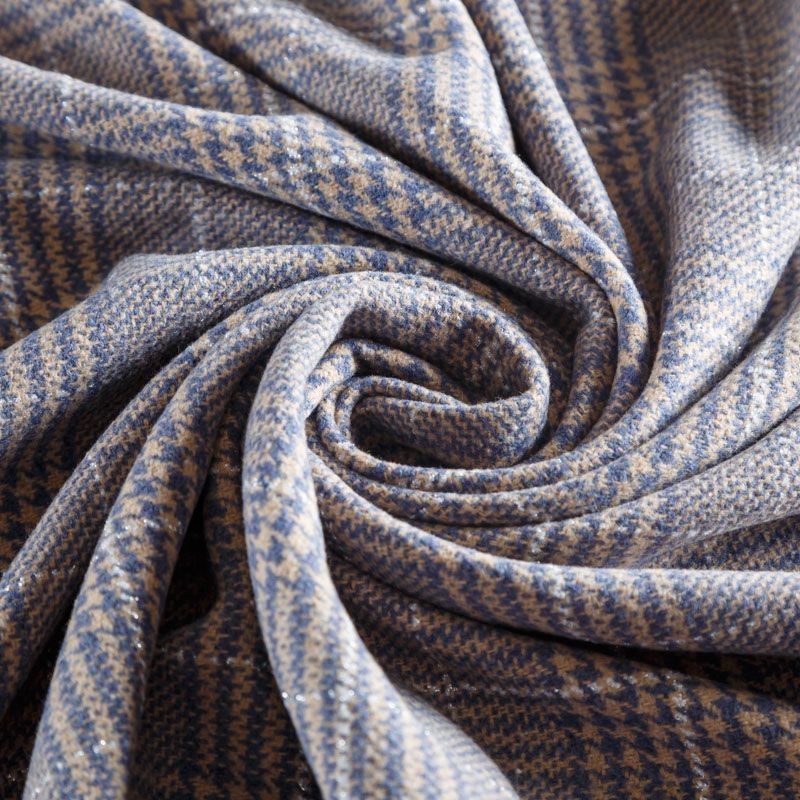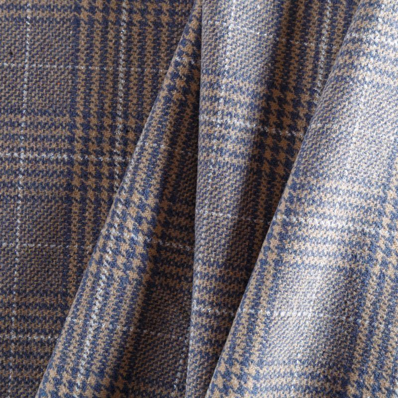 Плотная твидовая ткань с добавлением шерсти, мягкая и приятная на ощупь, формоустойчива, хорошо драпируется. Переплетение нитей голубого, белого,бежевого цветов в узоре "гусиная лапка" и люрексной нити образует сложную красивую клетку тартан. Ткань отлично подойдет для пошива пальто, теплых костюмов, юбки, шорт, жакета, кейпа, жилета.
