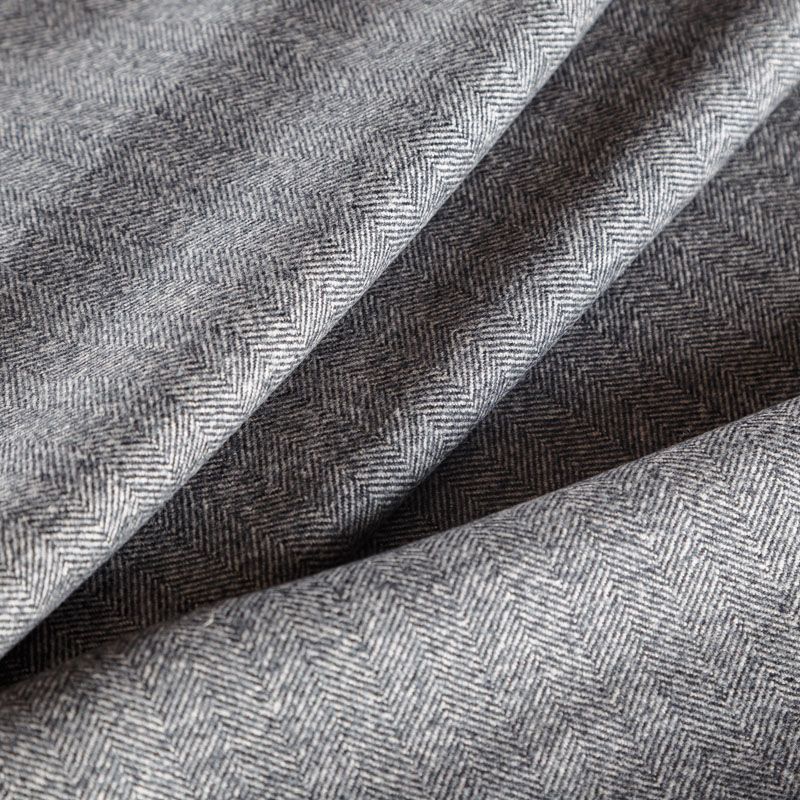 Итальянский шерстяной твид в ёлочку в классическом сером оттенке. Ткань выглядит дорого и статусно, хорошей плотности, в меру тяжёлая, пластичная, не мнется, приятная на ощупь, при драпировке образует красивую округлую складку. Подойдёт для пошива жакета, юбки, брюк, платья, легкого пальто, бомбера, мужского костюма или пальто.