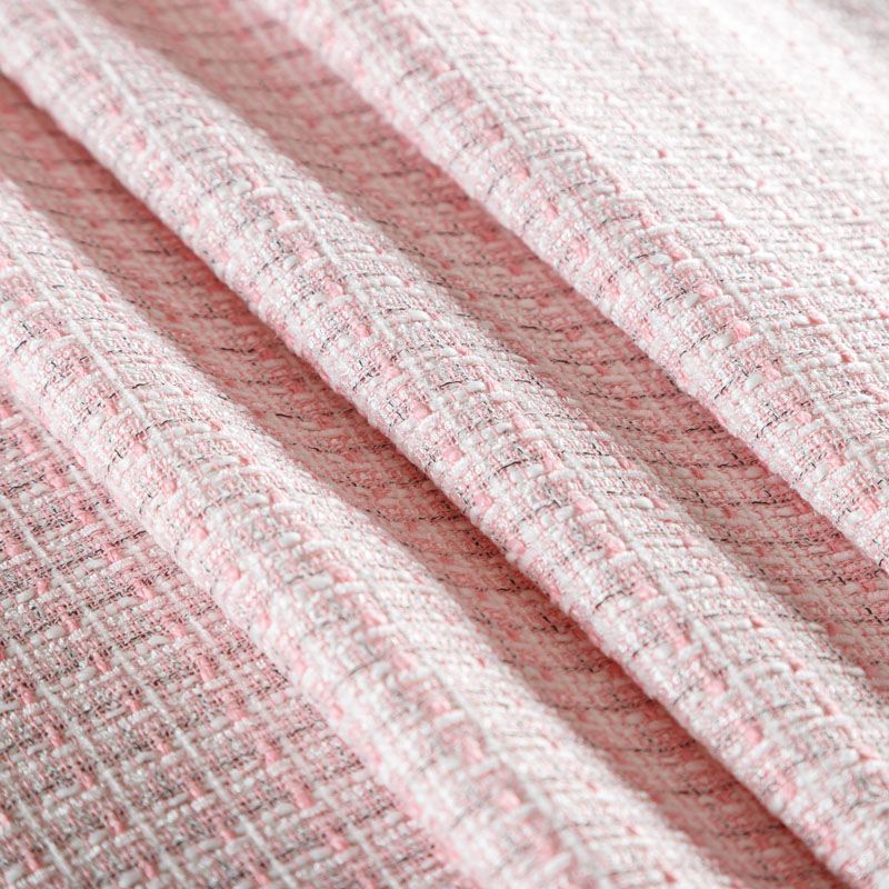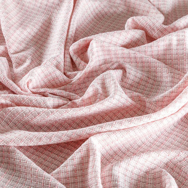 Отличительная особенность этой ткани в полотняном плетении нитей, характерного для рогожки, олицетворяющая сложную "клетчатую" геометрию в розово-молочных оттенках. Различная толщина нитей создает эффектную фактуру. Ткань достаточно формоустойчивая, при этом пластичная, гибкая за счет плетения,  матовая, мягкая, приятная на ощупь, не рыхлая. Прекрасно подойдет для пошива жакета, юбки в виде трапеции, легкого пальто, костюма.