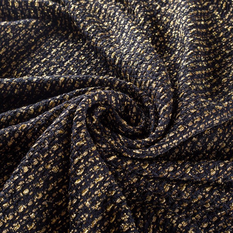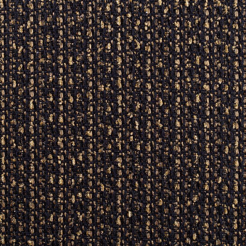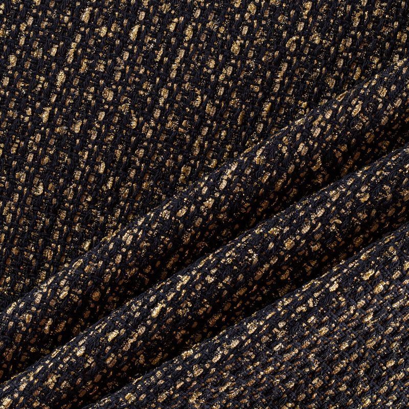 Твид черного цвета с золотыми нитями и лентами, которые, переплетаясь, образуют красивую фактуру с узелками различной толщины. Ткань украшена золотистой люрексной нитью, которая придает ей блеск и гламур. В меру рыхлая, плотная, будет уместна в изделиях "на каждый день" и "на выход".
