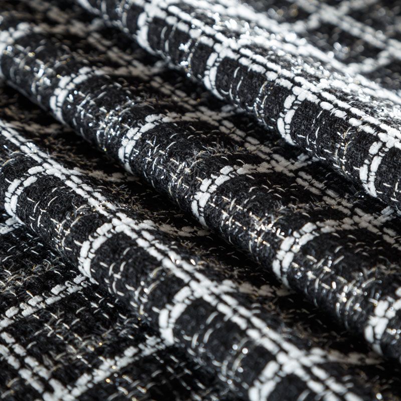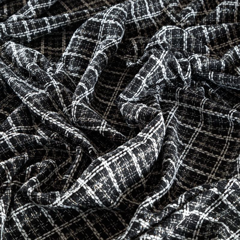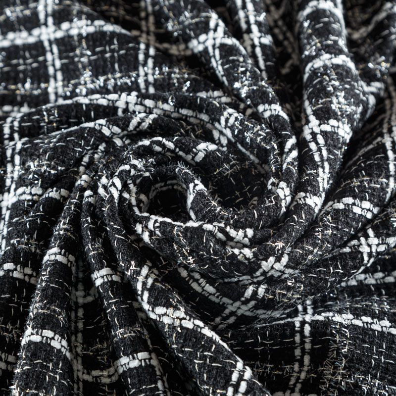 Мягкая, пластичная и объемная ткань, с разреженной и рельефной вывязанной структурой. Буклированный твид в стиле Шанель буквально соткан из различных по толщине и текстуре нитей, образующих рисунок в виде клетки. В плетение добавлена блестящая люрексная нить. Твид идеально подходит для пошива платьев, юбок, жакетов, легких пальто, эффектных бомберов и курток.