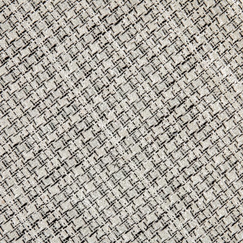 Мягкая, пластичная и объемная ткань, с разреженной и рельефной вывязанной структурой. Буклированный твид в стиле Шанель буквально соткан из различных по толщине и цвету нитей, образующих рисунок в виде клетки. В плетение добавлена серебристая люрексная нить, а также мелкие пайетки. Твид идеально подходит для пошива платьев, юбок, жакетов и легких пальто в стиле Шанель.