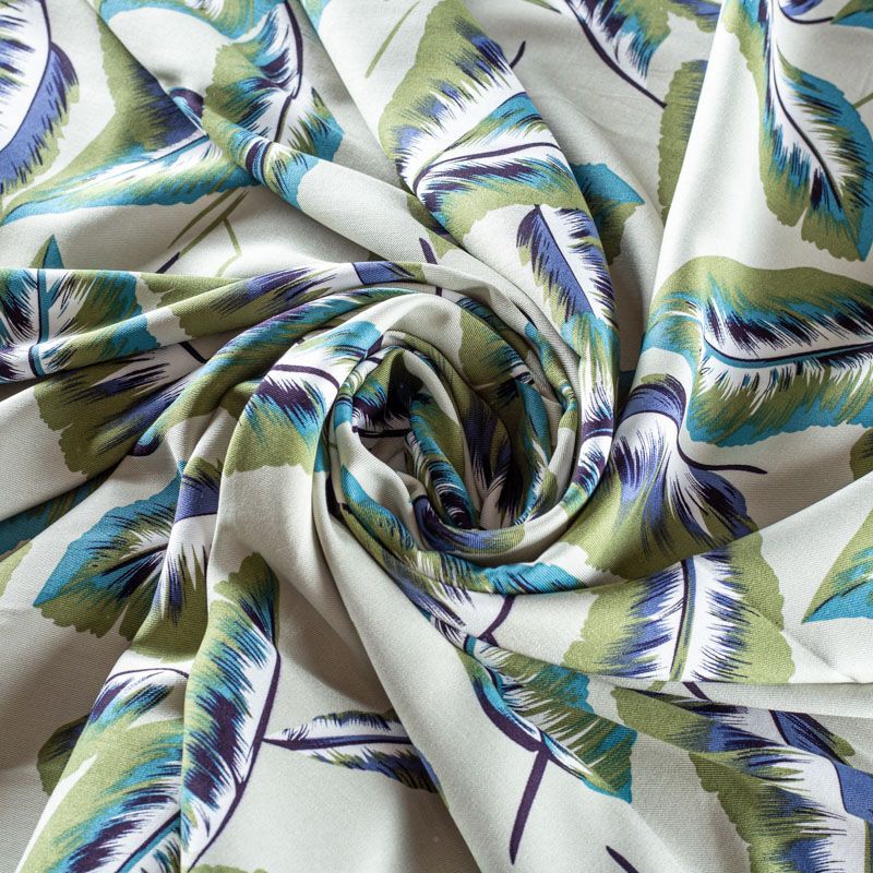Качественный твил-штапель с крупным растительным принтом на спокойном фоне. Мягкая ткань средней плотности, имеет саржевое плетение и характерный диагональный рубчик на поверхности. Хорошо сохраняет форму, не сильно мнется и не деформируется в процессе эксплуатации. Красиво ложится в складки, поэтому прекрасно подойдет на длинные драпированные юбки и платья, на свободные брюки или шорты, топы.