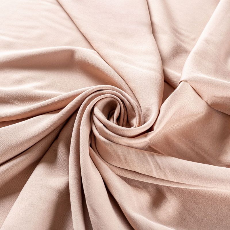 Плотная и мягкая ткань, имеет саржевое плетение и характерный диагональный рубчик на поверхности. Отлично сохраняет форму, не сильно мнется и не деформируется в процессе эксплуатации.  Красиво ложится в складки, поэтому прекрасно подойдет на длинные драпированные юбки и платья, на свободные брюки или шорты, топ