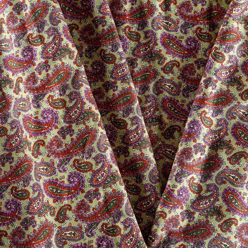Плотная и мягкая ткань фисташкового цвета с цветным узором пейсли, имеет саржевое плетение и характерный диагональный рубчик на поверхности. Отлично сохраняет форму, не сильно мнется и не деформируется в процессе эксплуатации. Красиво ложится в складки, поэтому прекрасно подойдет на длинные драпированные юбки и платья, на свободные брюки или шорты, топы.