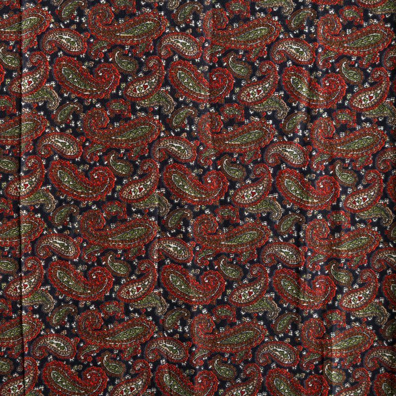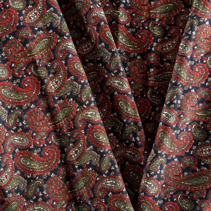 Плотная и мягкая ткань черного цвета с узором пейсли в красно-зеленых оттенках, имеет саржевое плетение и характерный диагональный рубчик на поверхности. Отлично сохраняет форму, не сильно мнется и не деформируется в процессе эксплуатации.  Красиво ложится в складки, поэтому прекрасно подойдет на длинные драпированные юбки и платья, на свободные брюки или шорты, топы.