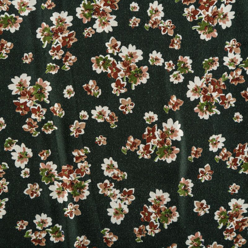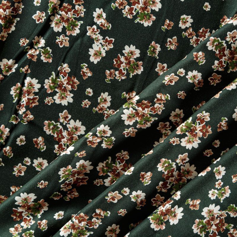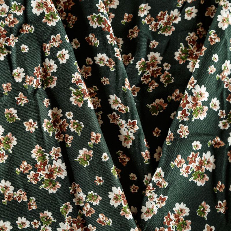 Плотная и мягкая ткань темно-зеленого оттенка с бежевым мелкоцветом, имеет саржевое плетение и характерный диагональный рубчик на поверхности. Отлично сохраняет форму, не сильно мнется и не деформируется в процессе эксплуатации. Красиво ложится в складки, поэтому прекрасно подойдет на длинные драпированные юбки и платья, на свободные брюки или шорты, топы.
