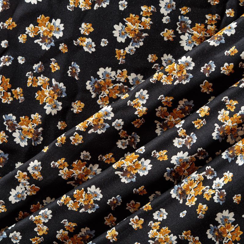Плотная и мягкая ткань черного цвета с ярким мелкоцветом, имеет саржевое плетение и характерный диагональный рубчик на поверхности. Отлично сохраняет форму, не сильно мнется и не деформируется в процессе эксплуатации. Красиво ложится в складки, поэтому прекрасно подойдет на длинные драпированные юбки и платья, на свободные брюки или шорты, топы.