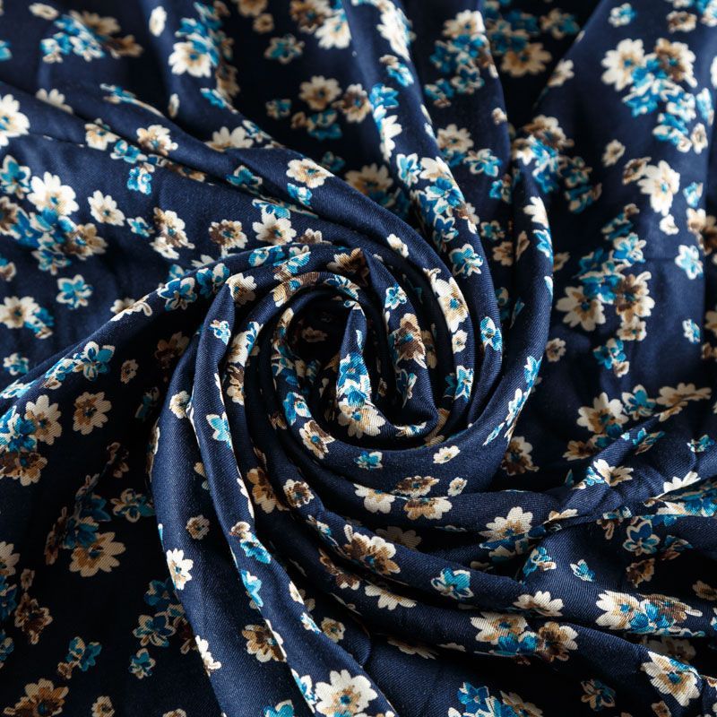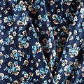 Плотная и мягкая ткань тесно-синего оттенка с ярким мелкоцветом, имеет саржевое плетение и характерный диагональный рубчик на поверхности. Отлично сохраняет форму, не сильно мнется и не деформируется в процессе эксплуатации. Красиво ложится в складки, поэтому прекрасно подойдет на длинные драпированные юбки и платья, на свободные брюки или шорты, топы.