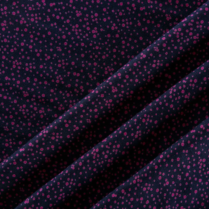Плотная и мягкая ткань фиолетово-синего оттенка с хаотичным мелким принтом цвета фуксии, имеет саржевое плетение и характерный диагональный рубчик на поверхности. Отлично сохраняет форму, не сильно мнется и не деформируется в процессе эксплуатации. Красиво ложится в складки, поэтому прекрасно подойдет на длинные драпированные юбки и платья, на свободные брюки или шорты, топы.