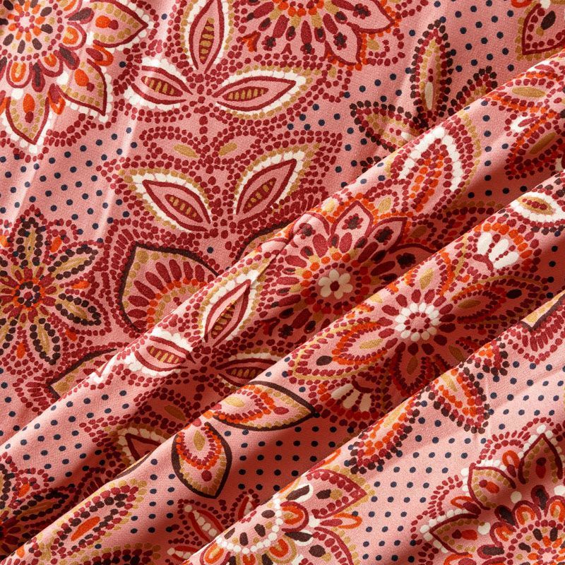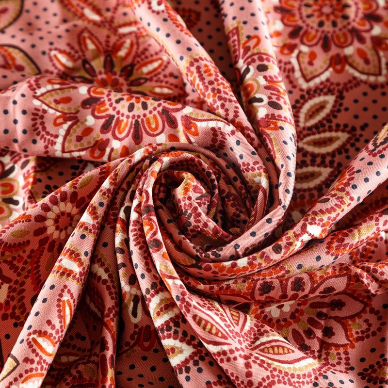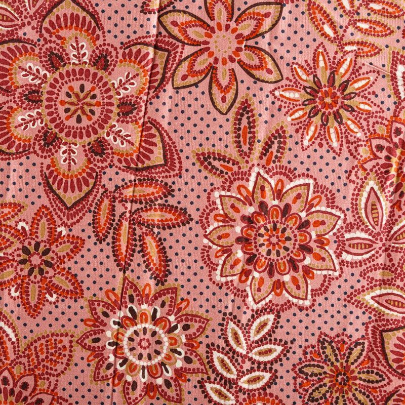 Плотная и мягкая ткань припыленного розового оттенка со стилизованным цветочным орнаментом, имеет саржевое плетение и характерный диагональный рубчик на поверхности. Отлично сохраняет форму, не сильно мнется и не деформируется в процессе эксплуатации. Красиво ложится в складки, поэтому прекрасно подойдет на длинные драпированные юбки и платья, на свободные брюки или шорты, топы.