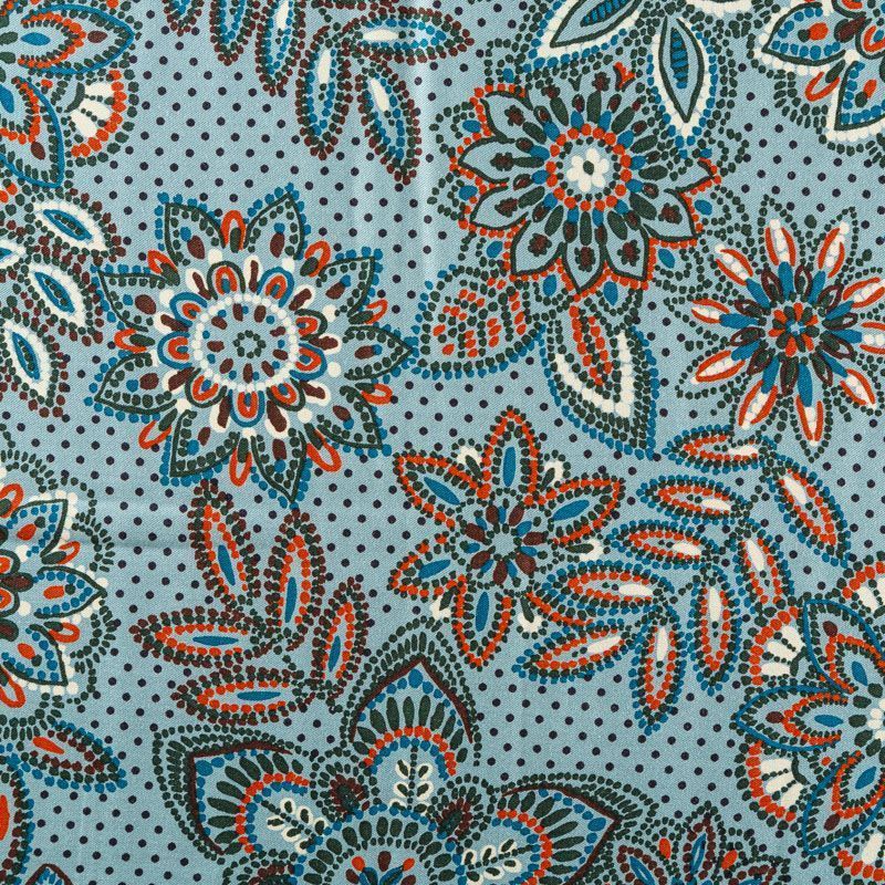 Плотная и мягкая ткань мятно-зеленого оттенка со стилизованным цветочным орнаментом, имеет саржевое плетение и характерный диагональный рубчик на поверхности. Отлично сохраняет форму, не сильно мнется и не деформируется в процессе эксплуатации.  Красиво ложится в складки, поэтому прекрасно подойдет на длинные драпированные юбки и платья, на свободные брюки или шорты, топы.
