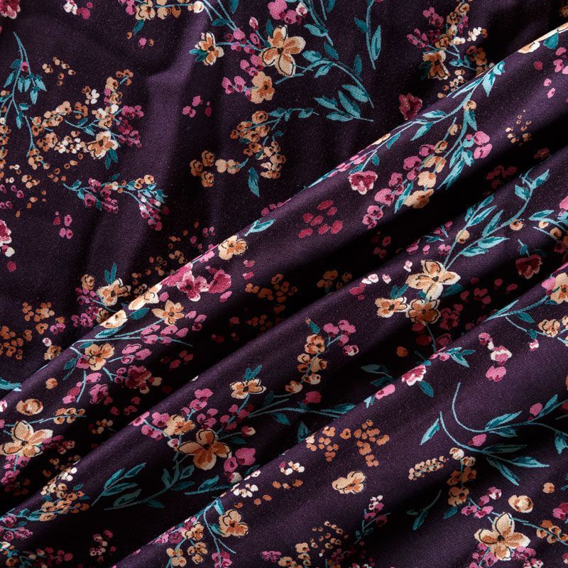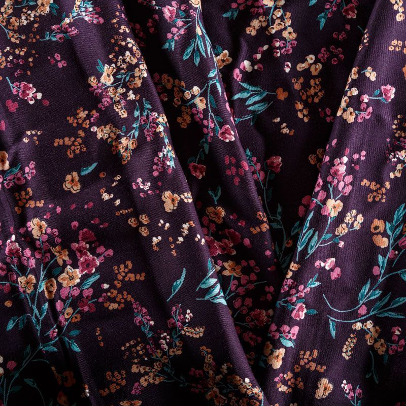 Плотная и мягкая ткань фиолетового оттенка с ярким мелкоцветом, имеет саржевое плетение и характерный диагональный рубчик на поверхности. Отлично сохраняет форму, не сильно мнется и не деформируется в процессе эксплуатации.  Красиво ложится в складки, поэтому прекрасно подойдет на длинные драпированные юбки и платья, на свободные брюки или шорты, топы.