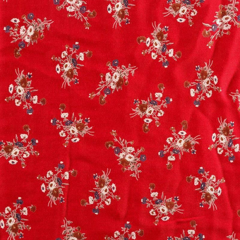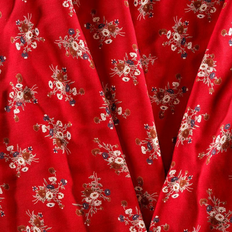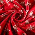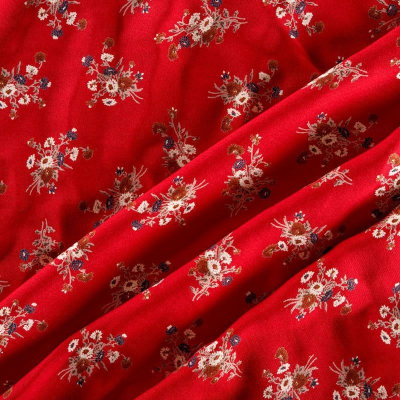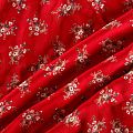 Плотная и мягкая ткань красного оттенка с ярким мелкоцветом, имеет саржевое плетение и характерный диагональный рубчик на поверхности. Отлично сохраняет форму, не сильно мнется и не деформируется в процессе эксплуатации. Красиво ложится в складки, поэтому прекрасно подойдет на длинные драпированные юбки и платья, на свободные брюки или шорты, топы, комбинезоны, а также для домашней одежды.