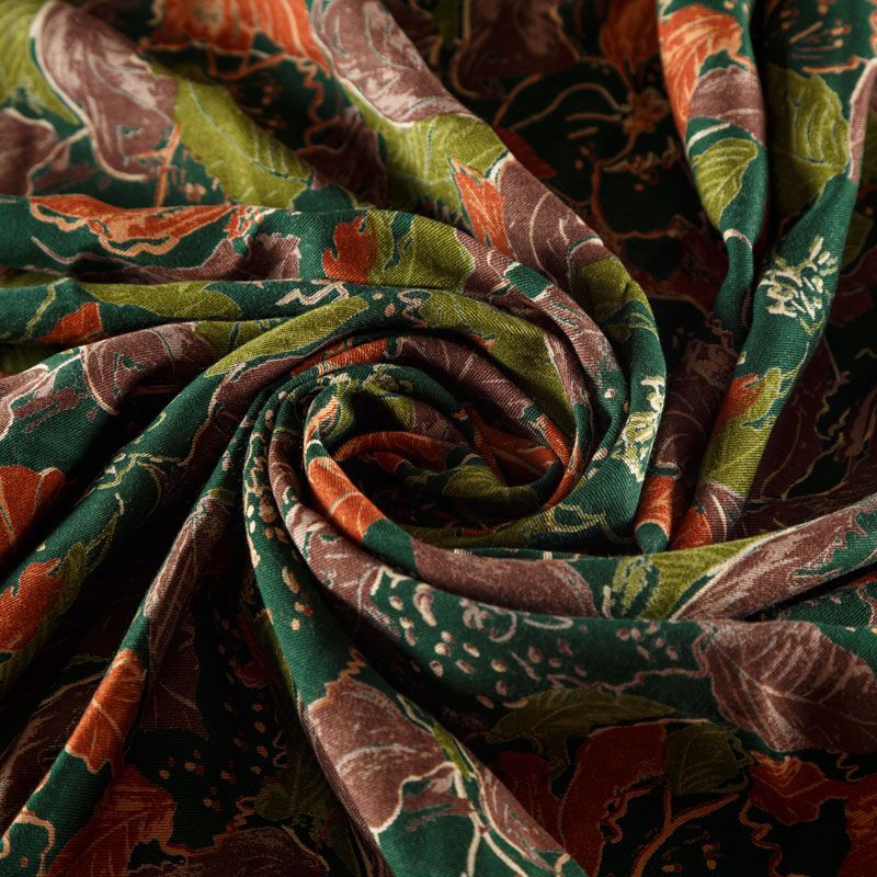 Плотная и мягкая ткань темно-зеленого цвета с растительным принтом в осенних оттенках, имеет саржевое плетение и характерный диагональный рубчик на поверхности. Отлично сохраняет форму, не сильно мнется и не деформируется в процессе эксплуатации. Красиво ложится в складки, поэтому прекрасно подойдет на длинные драпированные юбки и платья, на свободные брюки или шорты, топы, комбинезоны, а также для домашней одежды.
