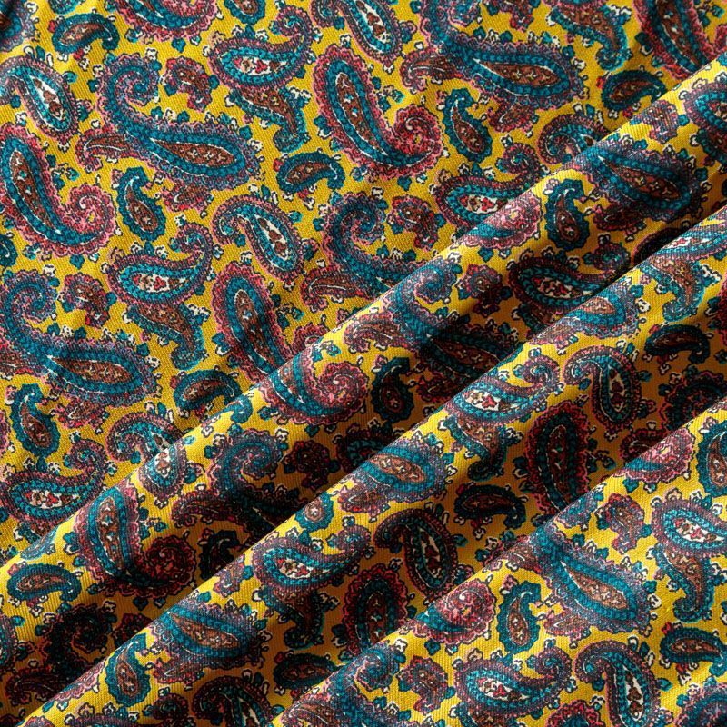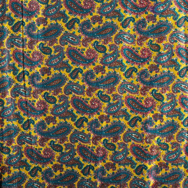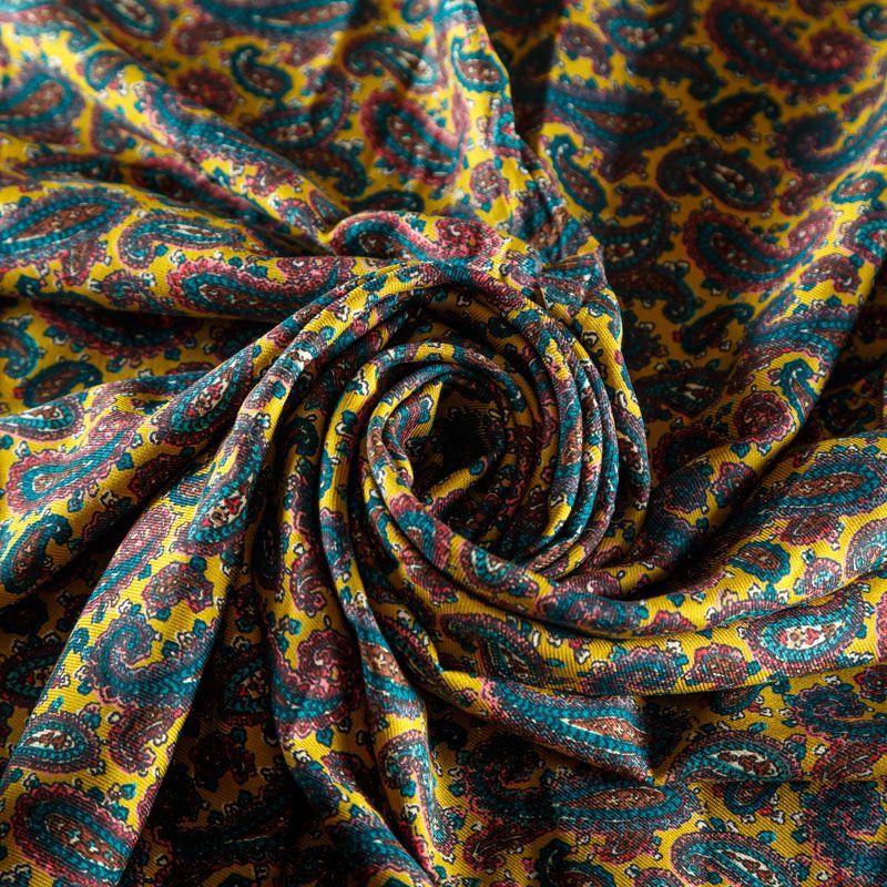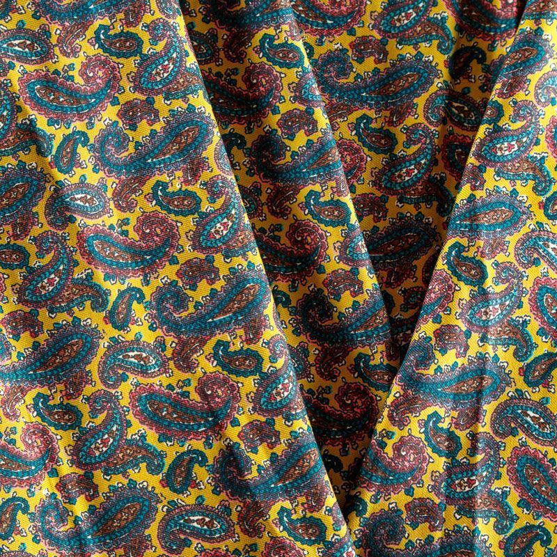 Плотная и мягкая ткань желтого оттенка с изумрудно-коричневым узором пейсли, имеет саржевое плетение и характерный диагональный рубчик на поверхности. Отлично сохраняет форму, не сильно мнется и не деформируется в процессе эксплуатации. Красиво ложится в складки, поэтому прекрасно подойдет на длинные драпированные юбки и платья, на свободные брюки или шорты, топы, комбинезоны, а также для домашней одежды.
