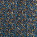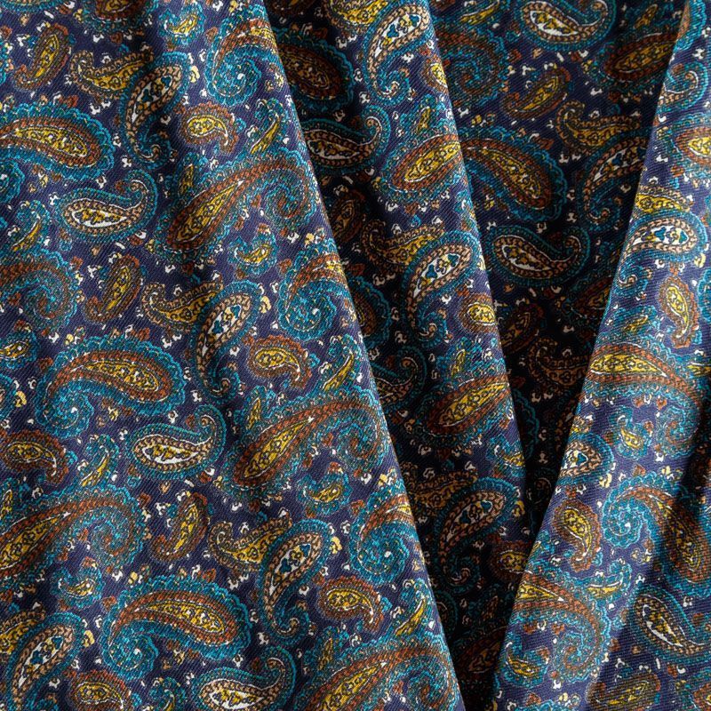 Плотная и мягкая ткань синего оттенка с богатым узором пейсли в желто-голубых тонах, имеет саржевое плетение и характерный диагональный рубчик на поверхности. Отлично сохраняет форму, не сильно мнется и не деформируется в процессе эксплуатации. Красиво ложится в складки, поэтому прекрасно подойдет на длинные драпированные юбки и платья, на свободные брюки или шорты, топы, комбинезоны, а также для домашней одежды.