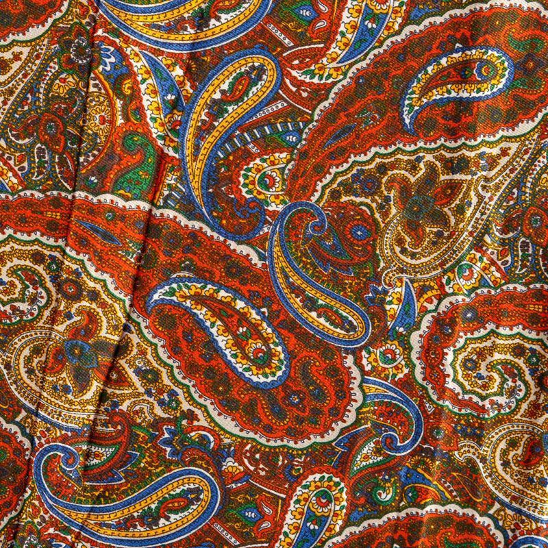 Плотная и мягкая ткань бежевого оттенка с богатым узором пейсли в желто-коричневых тонах, имеет саржевое плетение и характерный диагональный рубчик на поверхности. Отлично сохраняет форму, не сильно мнется и не деформируется в процессе эксплуатации. Красиво ложится в складки, поэтому прекрасно подойдет на длинные драпированные юбки и платья, на свободные брюки или шорты, топы, комбинезоны, а также для домашней одежды.