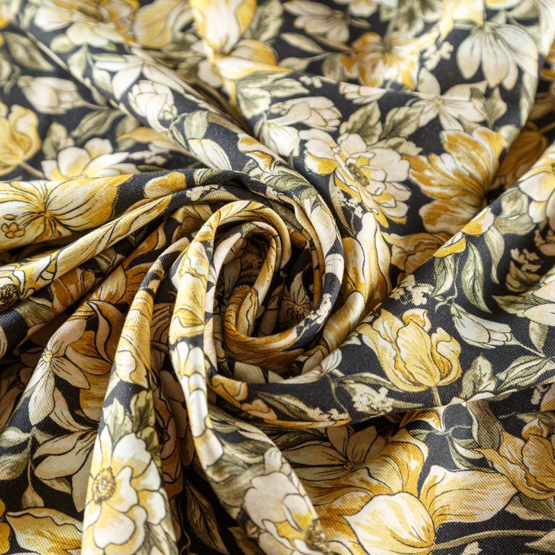 Плотная и мягкая ткань, имеет саржевое плетение и характерный диагональный рубчик на поверхности. Отлично сохраняет форму, не сильно мнется и не деформируется в процессе эксплуатации. Красиво ложится в складки, поэтому прекрасно подойдет на длинные драпированные юбки и платья, на свободные брюки или шорты, топы.