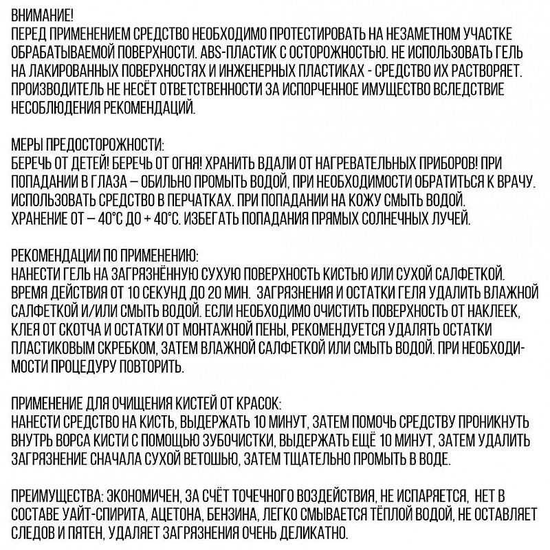 Универсальный очиститель – средство для очищения поверхностей, кистей и инструментов. Предназначен для эффективного очищения различных поверхностей: мебели - столы, стулья, парты, т.е. твёрдых; паркета, линолеума, стекла, металла, оконного профиля, пластика ПВХ, магнитно-маркерных досок, а также инструментов, кистей и палитр. Очищает сложные загрязнения: различные виды красок: акриловые, масляные, алкидные, аэрозольные, граффити, темперные, штемпельные, эбру; чернила от ручки, фломастер, перманентный маркер, лак, акриловый клей, штрих, клеевую основу от скотча и наклеек, двухсторонний бумажный скотч, наклейки, эпоксидную смолу, йод, зелёнку, фукорцин. Можно применять после ремонта и стройки для удаления: остатков монтажной пены, акрилового герметика, битума, декоративной штукатурки. Форма: гель. Упаковка: флакон с дозатором. Объём: 30 мл. Состав: 90% пищевых добавок, 5% неионогенных ПАВ, 5% загуститель. Срок годности: 36 месяцев.
