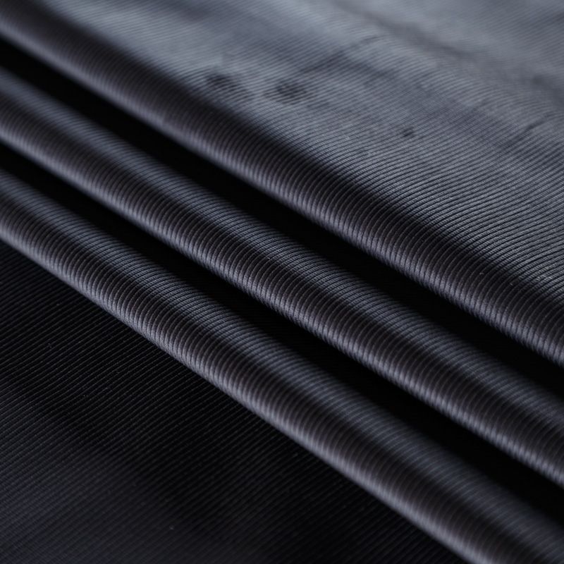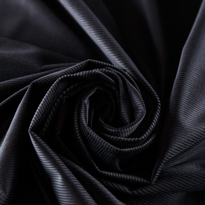 Итальянский костюмно-плательный вельвет из хлопка в черном оттенке. Очень приятный тактильно, поверхность бархатистая, рубчик средней ширины, тянется за счет эластана в составе, не просвечивает. Подойдет для пошива костюма, платья, юбки, брюк, верхней одежды.