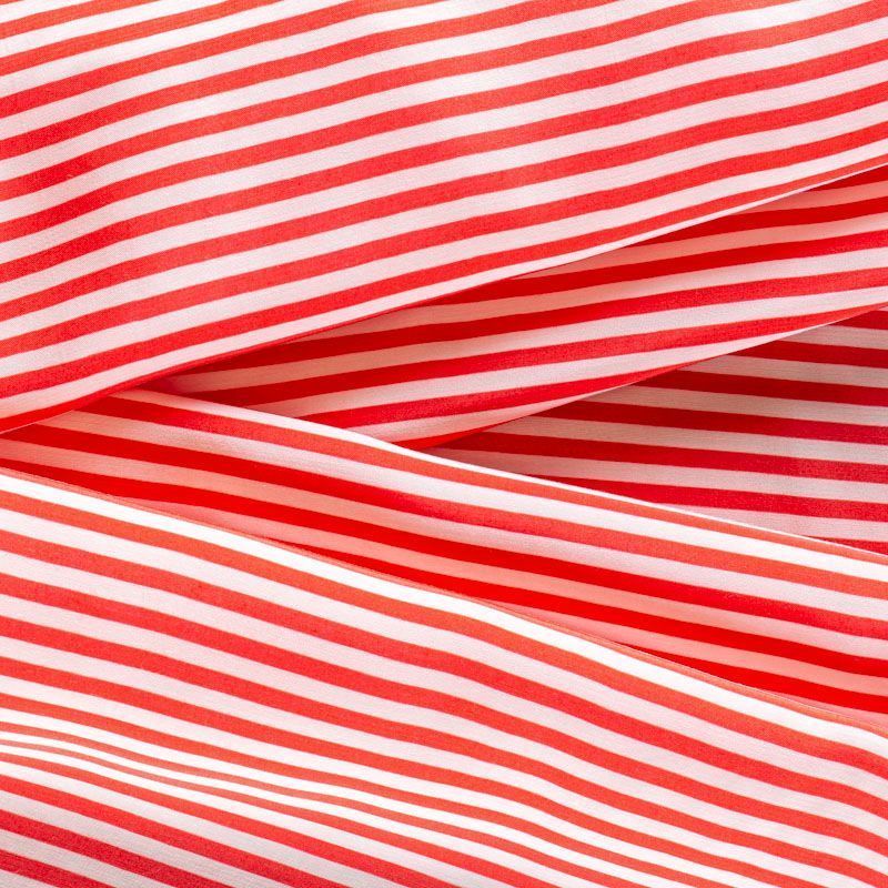 Плательно-рубашечная итальянская вискоза с принтом в горизонтальную полоску красного цвета. Натуральная, дышащая ткань, очень приятная к телу, отлично драпируется, струится, не просвечивает. Хорошо подойдет для пошива платьев, рубашек, платьев-рубашек, блуз, юбок, брюк, летних костюмов, пыльников, детской одежды.