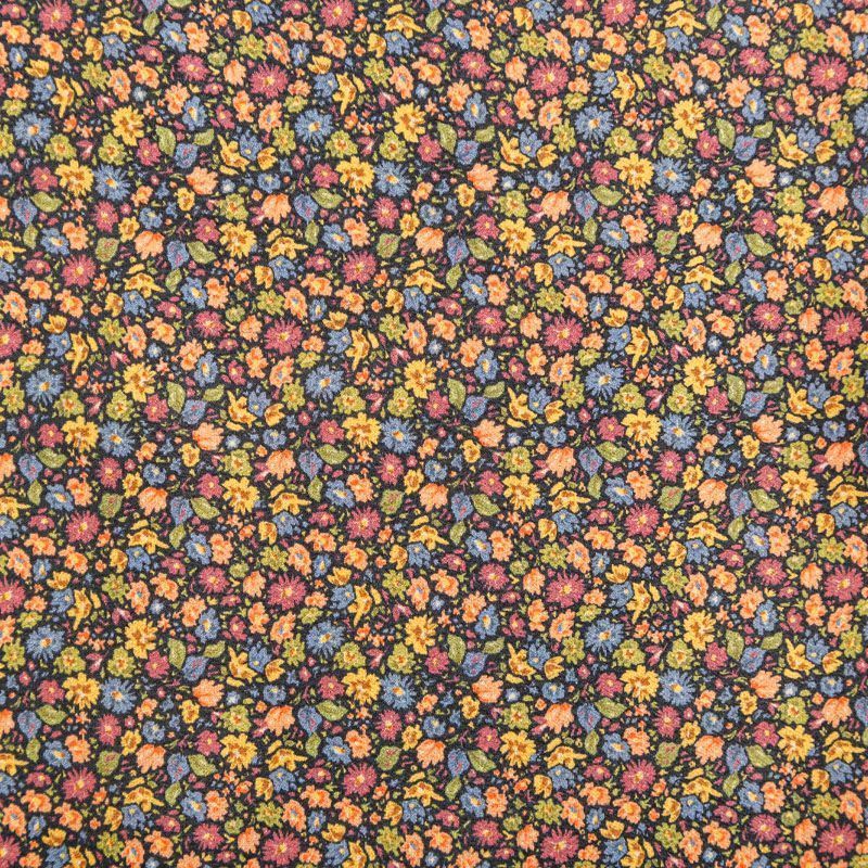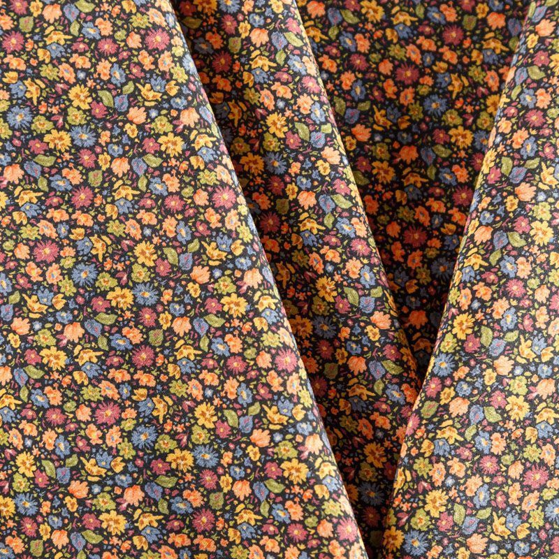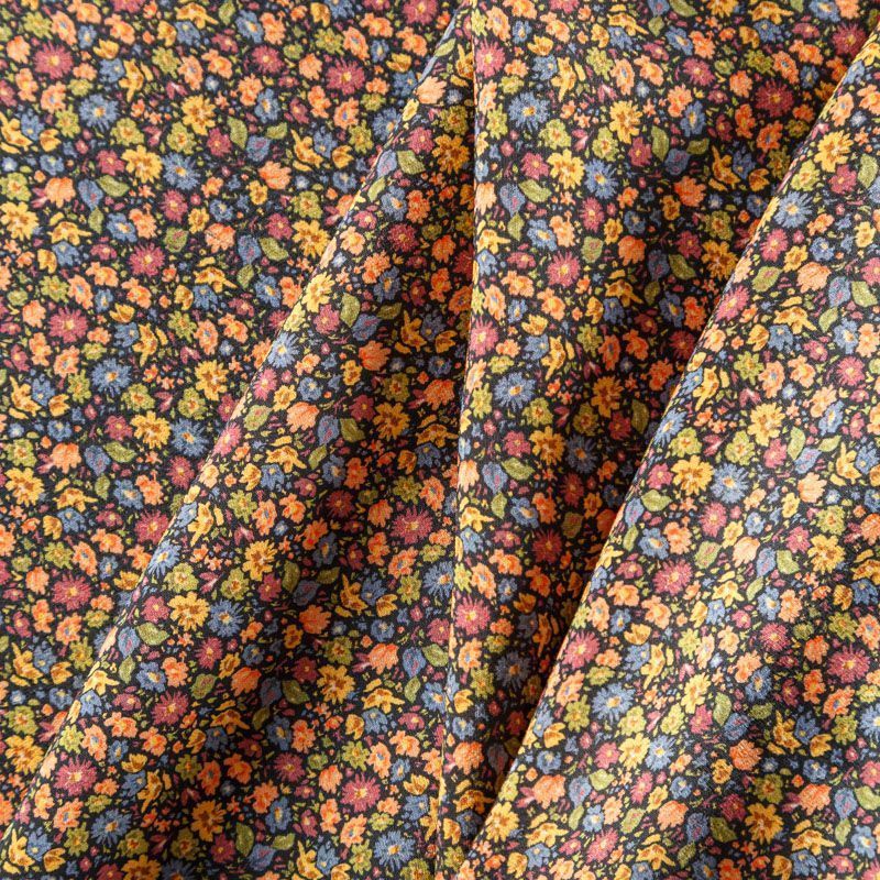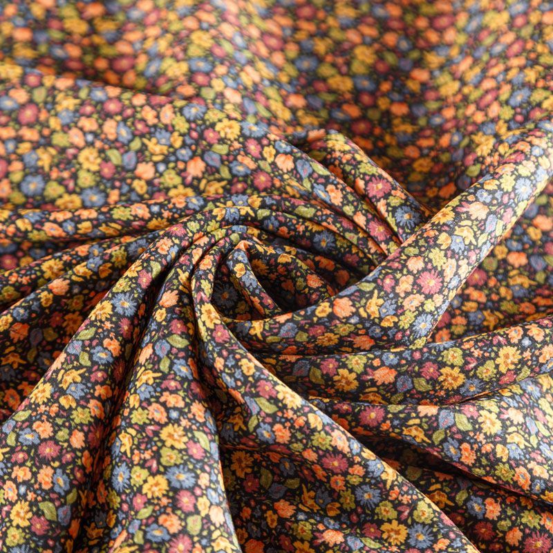 Итальянская вискоза черного оттенка с популярным ярким мелкоцветом. Ткань тонкая, но не просвечивает, отлично драпируется и струится, приятная на ощупь. Прекрасно подойдет для пошива платья, сарафана, топа, блузки, юбки, пижамного костюма.