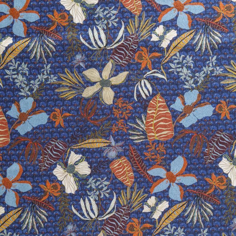 Итальянская плательно-блузочная вискоза со стилизованным цветочным принтом на темно-синем фоне. Ткань очень пластичная, отлично драпируется и струится, мягкая и приятная на ощупь, не просвечивает. Прекрасно подойдет для пошива платья, рубашки, топа, блузки, юбки, летнего костюма.