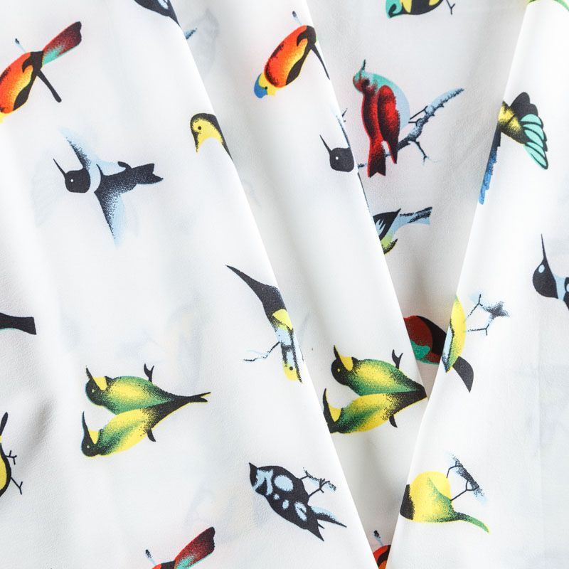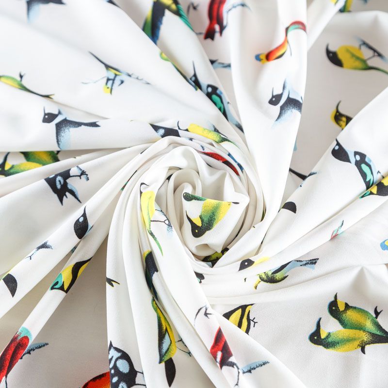 Легкая набивная ткань имеет высокую прочность, большую износоустойчивость. Материал упругий, мягкий, тянется за счет эластана в составе, хорошо драпируется, образует струящиеся складки. Идеально подойдет для пошива блуз, юбок, платьев, сарафанов.
