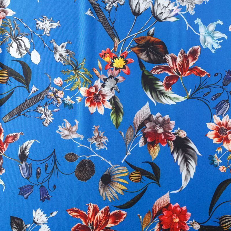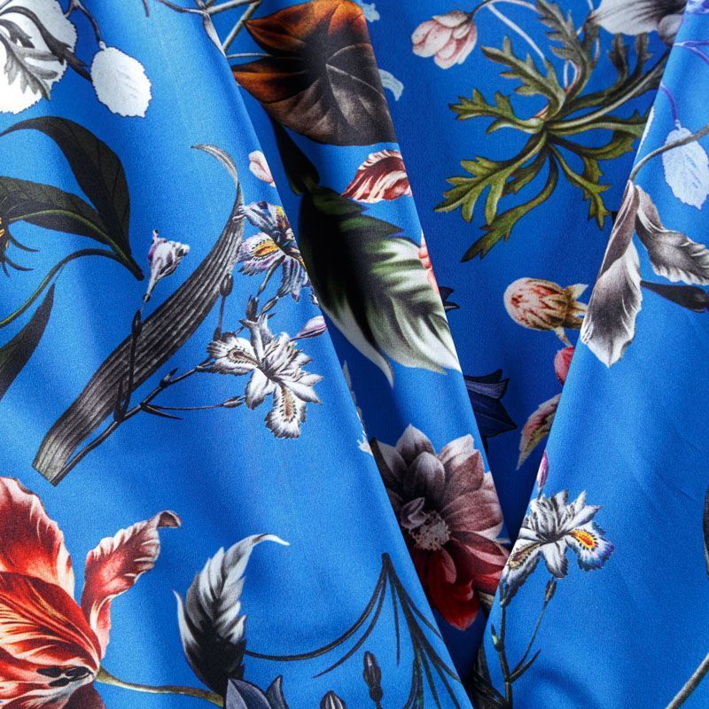 Легкая набивная ткань с цветочным принтом имеет высокую прочность, большую износоустойчивость. Ткань упругая, мягкая и хорошо драпируется, тянется за счет эластана в составе, образует струящиеся складки. Идеально подойдет для пошива блуз, юбок, платьев, сарафанов.