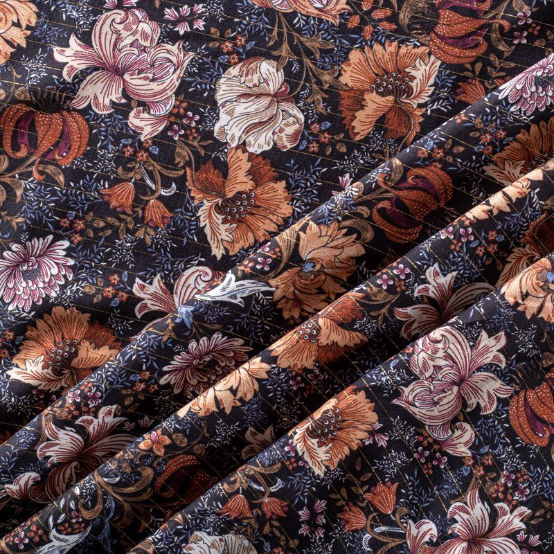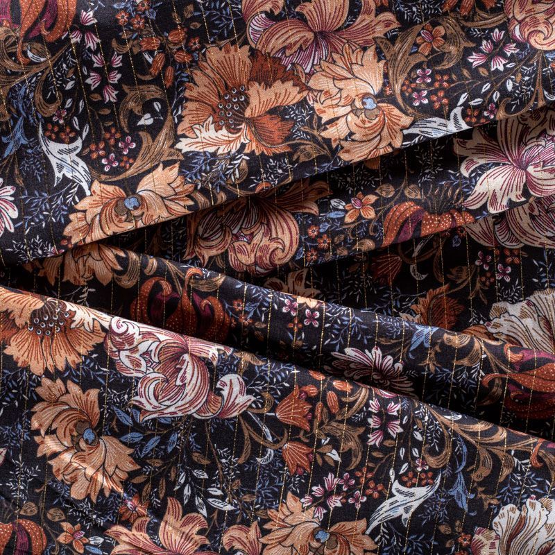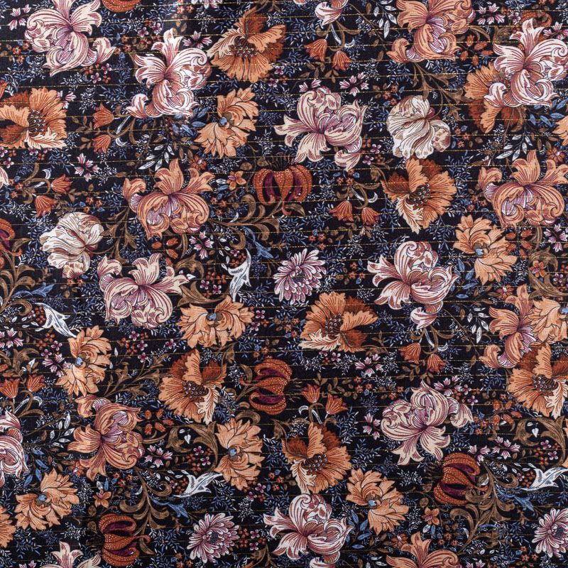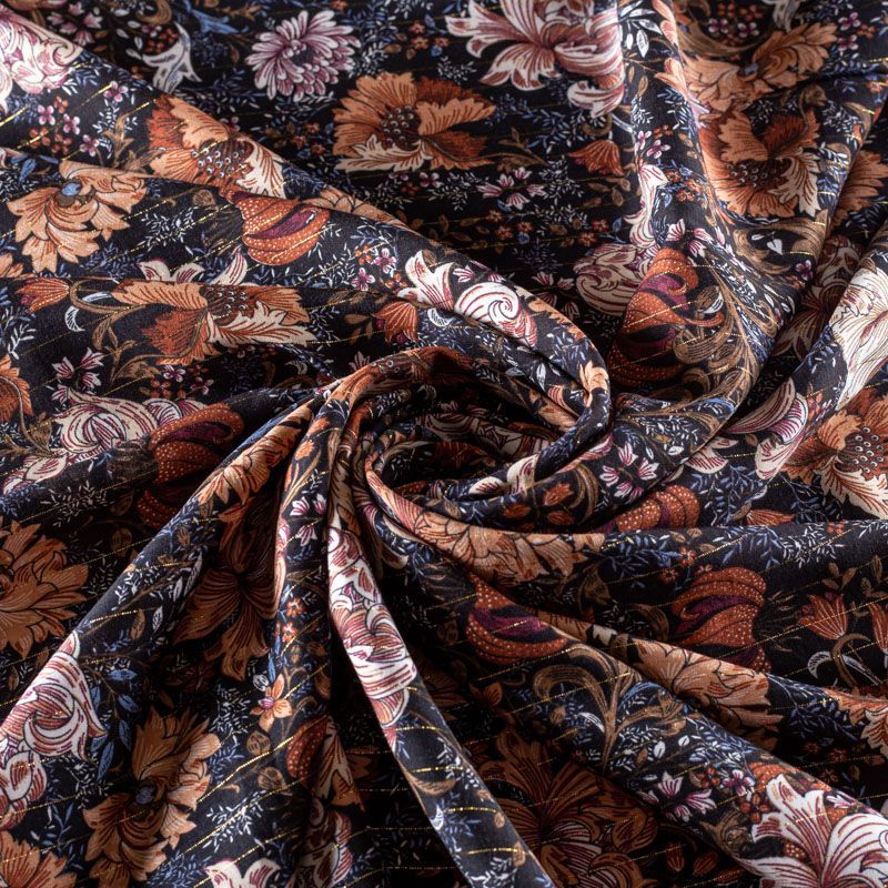 Итальянская плательно-блузочная вискоза с фантазийным растительным принтом на черном фоне декорирована тонкой люрексовой нитью. Ткань очень пластичная, отлично драпируется и струится, мягкая и приятная на ощупь, не просвечивает. Прекрасно подойдет для пошива платья, топа, блузки, юбки.