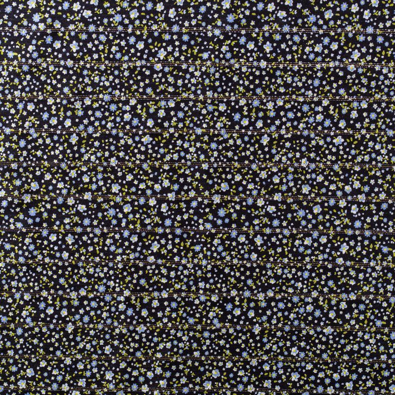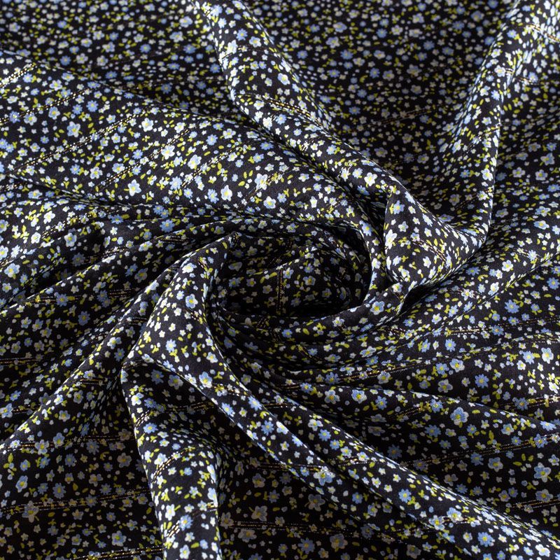 Итальянская плательно-блузочная вискоза с мелким цветочным принтом на черном фоне декорирована тонкой люрексовой полоской. Ткань очень пластичная, отлично драпируется и струится, мягкая и приятная на ощупь, не просвечивает. Прекрасно подойдет для пошива платья, топа, блузки, юбки.