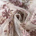 3D вышивка на сетке телесного оттенка. Мягкая, пластичная сетка украшена объемным флористическим узором в розово-зеленых тонах. Цвет сам по себе очень нежный, но если сложить ткань в несколько слоев, тон становится более насыщенным. Полотно легкое, воздушное, матовое. Идеален для вечерних нарядов, платьев на выпускной бал, бальных костюмов, пышных юбок-пачек, а также блузок.
