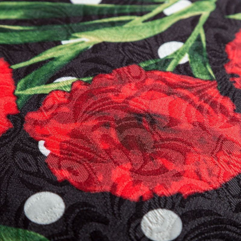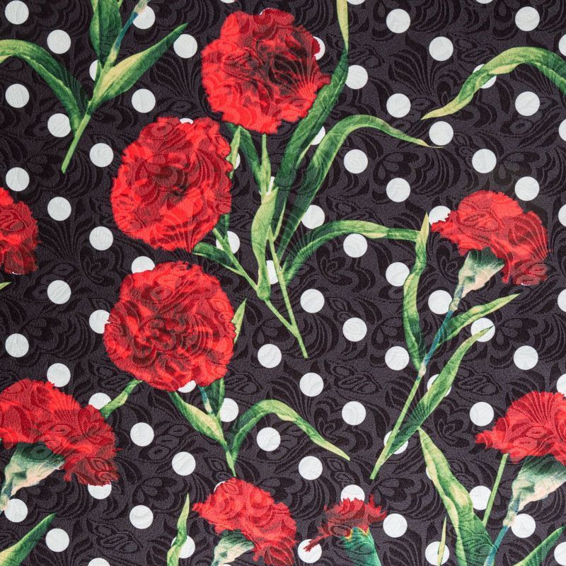 Нарядный жаккард черного цвета в белый горох в сочетании с яркими акцетными цветами, расположенными по всему полотну. Ткань плотная, хорошо драпируется и держит форму, с красивой фактурой, образованной жаккардовым плетением. Ткань обладает высокой прочностью, не мнется и не просвечивает. Идеально подходит для летнего пальто, кардигана, жакета, костюма, юбки или шорт.