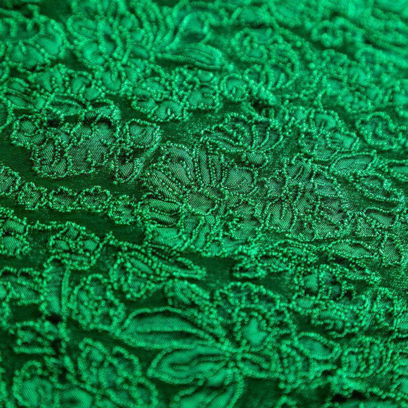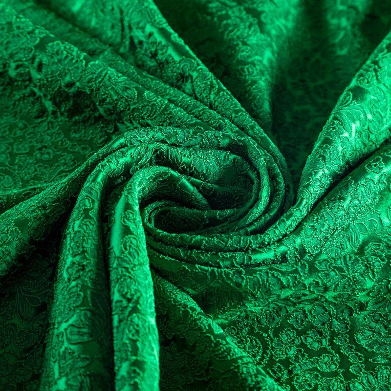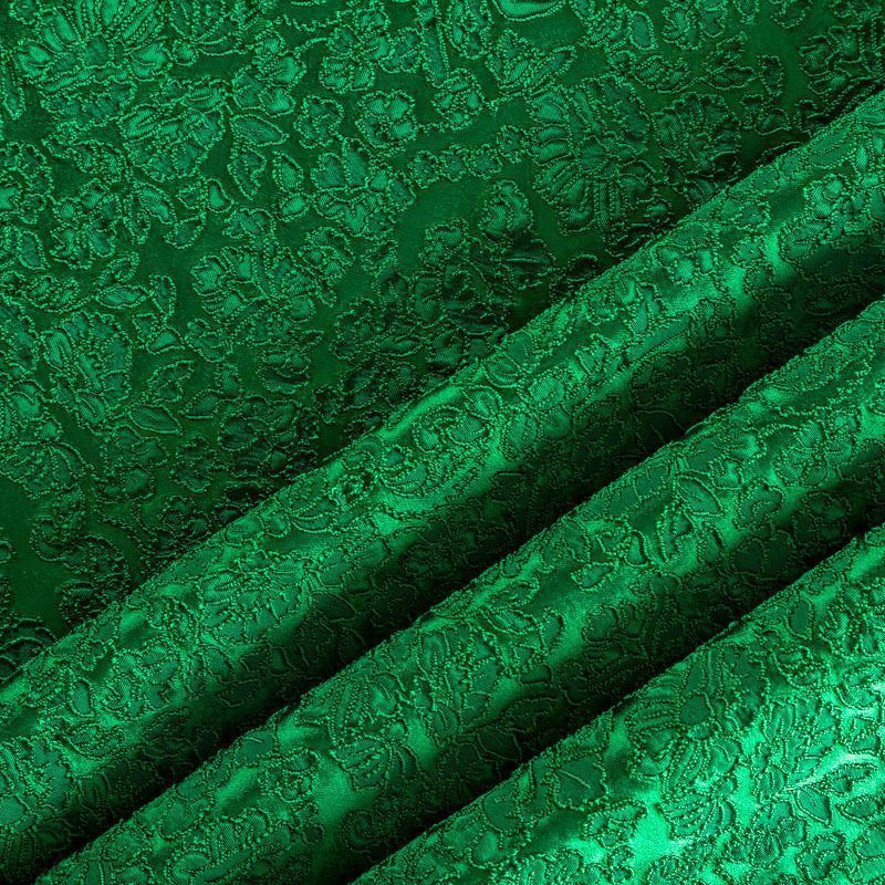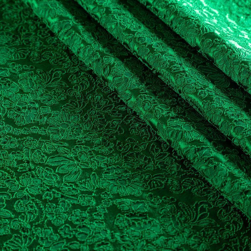 Итальянский жаккард с красивым цветочным дизайном темно-зеленого оттенка. Ткань легкая, но плотная, поверхность со сдержанным блеском объемная и текстурная, хорошо драпируется и держит форму, тянется за счет эластана в составе, не просвечивает. Подойдет для пошива нарядных вечерних костюмов, платьев-футляров в стиле Dior, жакетов, топов, легких пальто, бомберов, юбок или шорт.