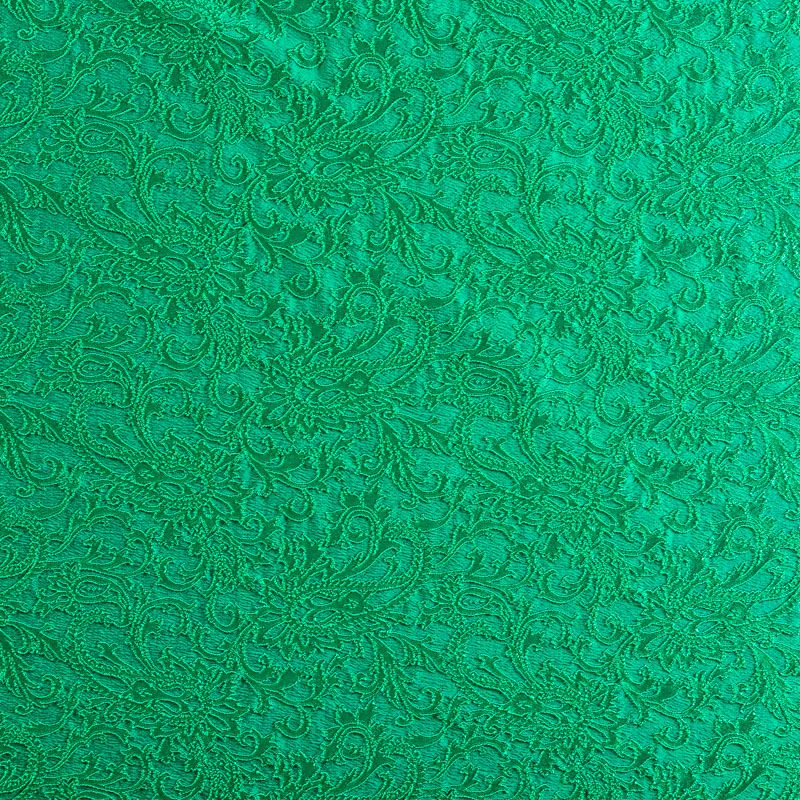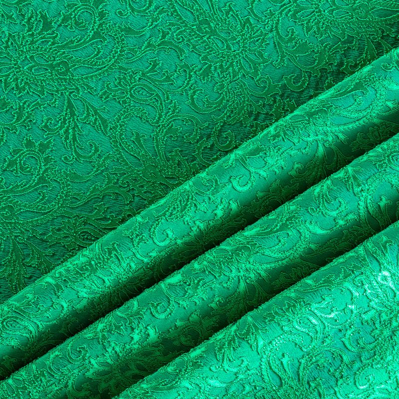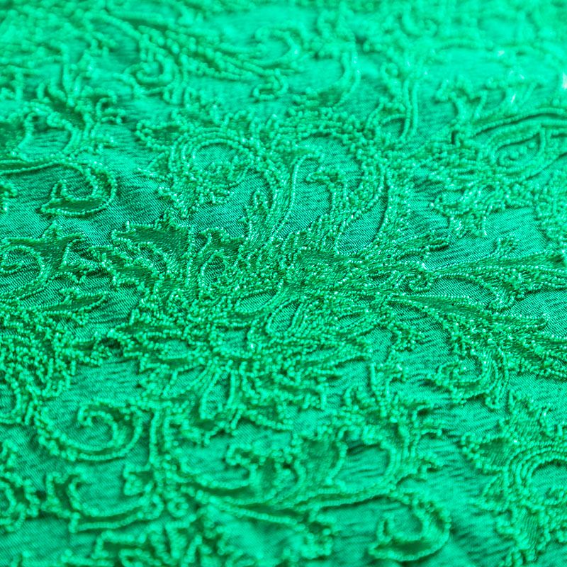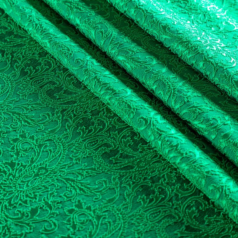 Итальянский жаккард с красивым сложным орнаментом зеленого оттенка. Ткань легкая, но плотная, поверхность со сдержанным блеском объемная и текстурная, хорошо драпируется и держит форму, тянется за счет эластана в составе, не просвечивает. Подойдет для пошива нарядных вечерних костюмов, платьев-футляров в стиле Dior, жакетов, топов, легких пальто, бомберов, юбок или шорт.