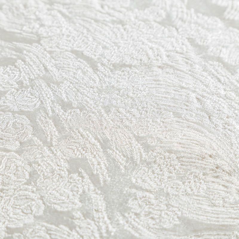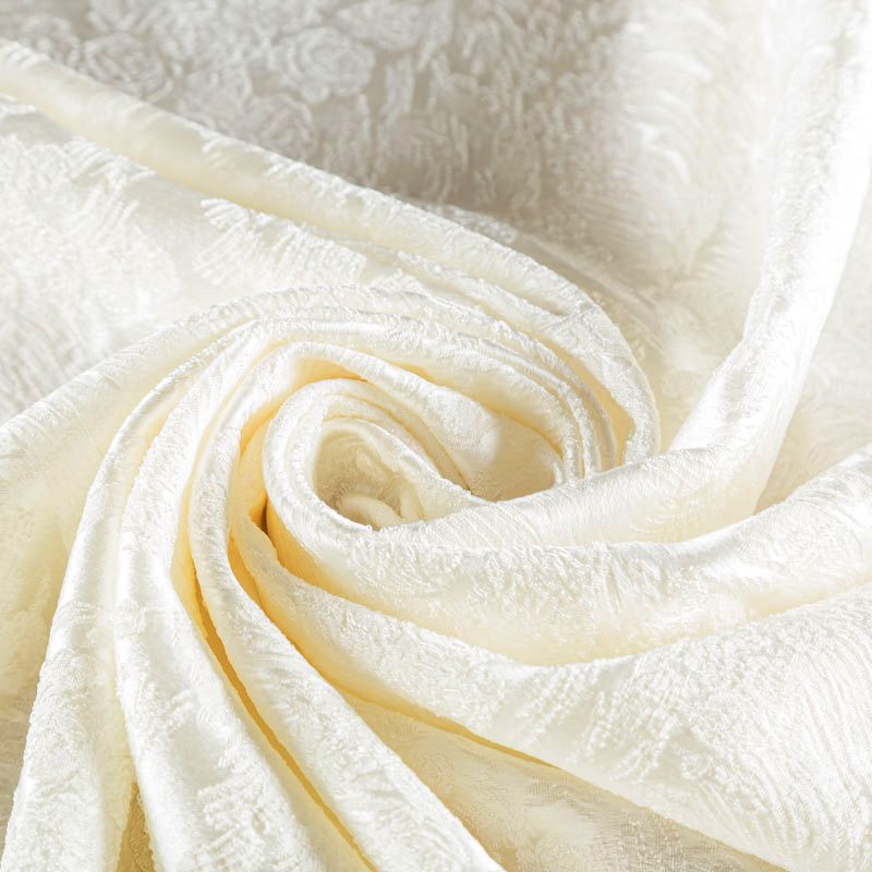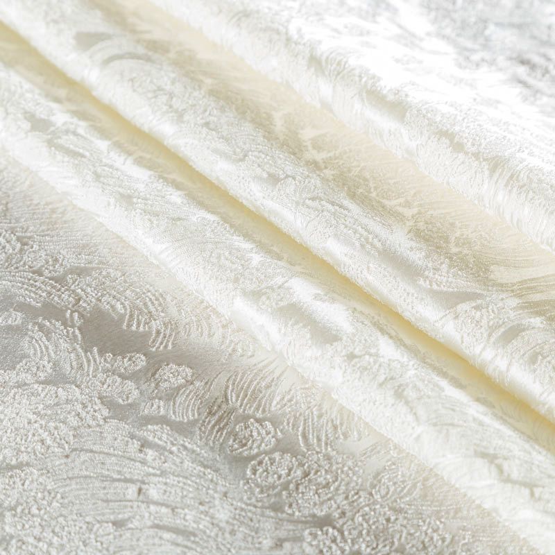 Итальянский жаккард с красивым орнаментом оттенка молочного жемчуга. Ткань легкая, но плотная, поверхность со сдержанным блеском, объемная и текстурная, хорошо драпируется и держит форму, тянется за счет эластана в составе, не просвечивает. Подойдет для пошива нарядных вечерних костюмов, корсетов, платьев-футляров, жакетов, топов, легких пальто, бомберов, юбок или шорт.