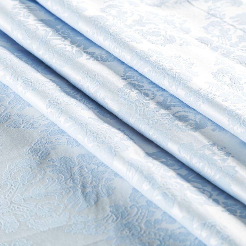 Нарядный жаккард на хлопковой основе с красивым сложным орнаментом холодного голубого оттенка. Ткань легкая, но плотная, поверхность со сдержанным блеском объемная и текстурная, хорошо драпируется и держит форму, тянется за счет эластана в составе, не просвечивает. Подойдет для пошива нарядных вечерних костюмов, платьев-футляров в стиле Dior, жакетов, топов, легких пальто, бомберов, юбок или шорт.