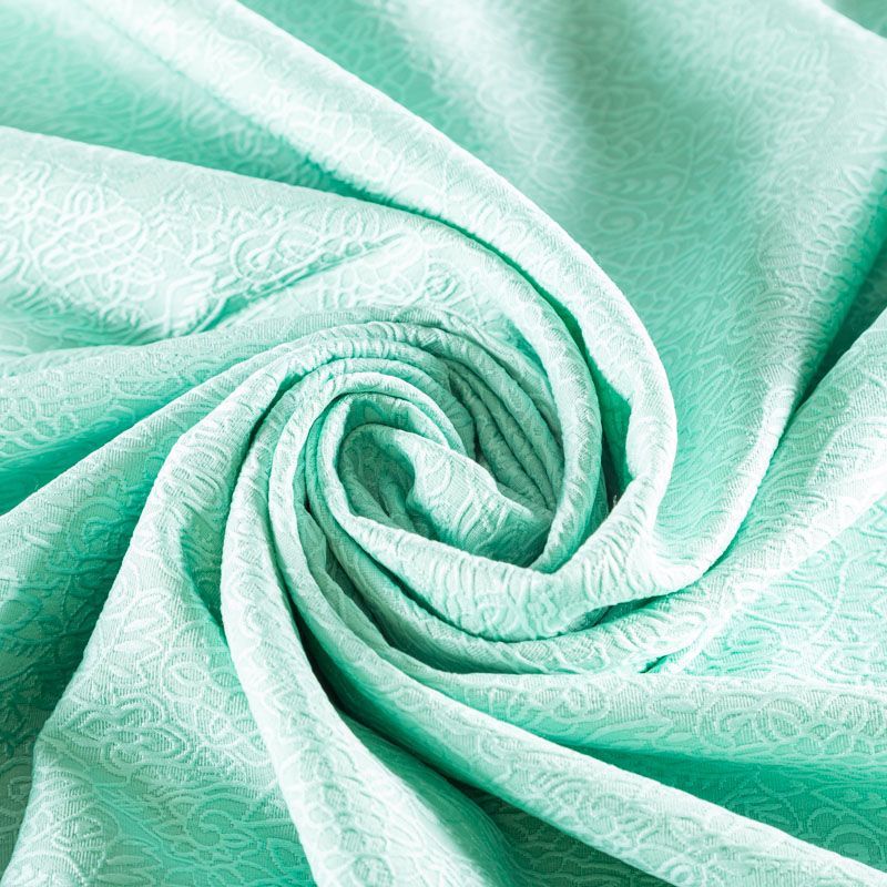 Нарядный жаккард на хлопковой основе с красивым сложным орнаментом мятного оттенка. Ткань легкая, но плотная, поверхность со сдержанным блеском объемная и текстурная, хорошо драпируется и держит форму, тянется за счет эластана в составе, не просвечивает. Подойдет для пошива нарядных вечерних костюмов, платьев-футляров в стиле Dior, жакетов, топов, легких пальто, бомберов, юбок или шорт.